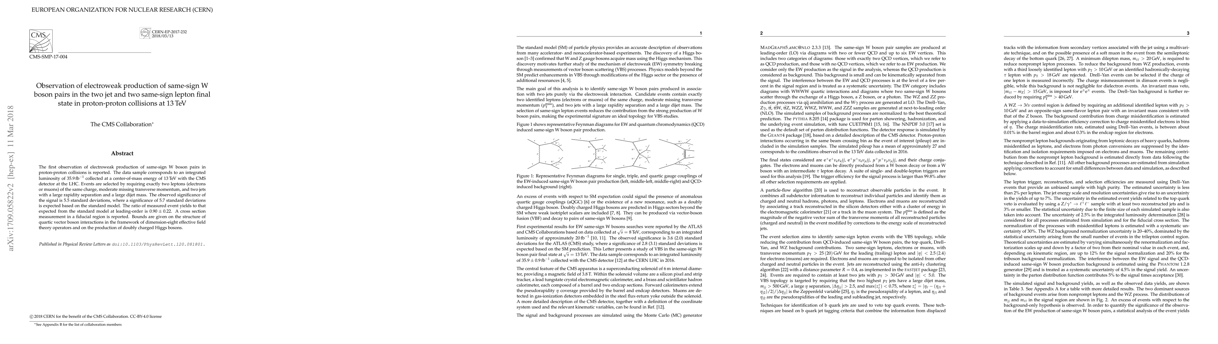 The first observation of electroweak production of same-sign W boson pairs in proton-proton collisions is reported. The data sample corresponds to an integrated luminosity of 35.9 fb$^{-1}$ collected at a center-of-mass energy of 13 TeV with the CMS detector at the LHC. Events are selected by requiring exactly two leptons (electrons or muons) of the same charge, moderate missing transverse momentum, and two jets with a large rapidity separation and a large dijet mass. The observed significance of the signal is 5.5 standard deviations, where a significance of 5.7 standard deviations is expected based on the standard model. The ratio of measured event yields to that expected from the standard model at leading-order is 0.90 $\pm$ 0.22. A cross section measurement in a fiducial region is reported. Bounds are given on the structure of quartic vector boson interactions in the framework of dimension-eight effective field theory operators and on the production of doubly charged Higgs bosons.