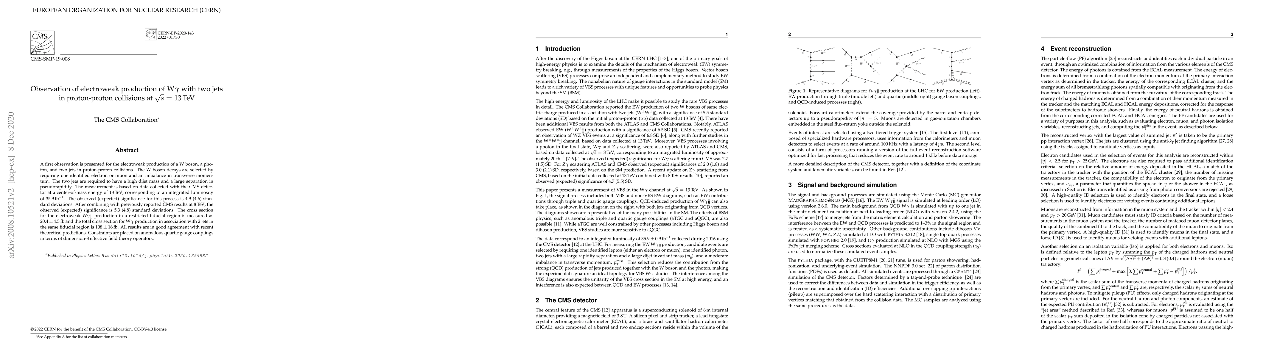 This paper reports the first observation of electroweak production of a W boson, a photon, and two jets in proton-proton collisions at 13 TeV, with a significance of 4.9 standard deviations. The cross section is measured and found to be consistent with theoretical predictions, and constraints on anomalous quartic gauge couplings are also derived.
