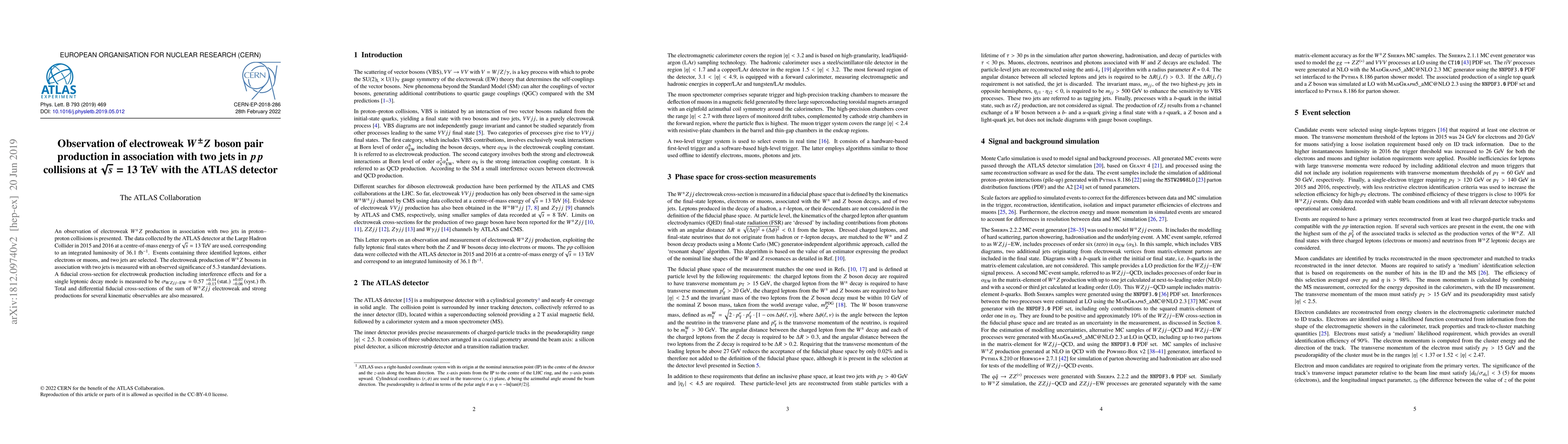 The ATLAS detector observed electroweak $W^{\pm}Z$ boson pair production in association with two jets in proton-proton collisions at 13 TeV, achieving a significance of 5.3 standard deviations. The fiducial cross-section for this process was measured to be 0.57 fb with statistical and systematic uncertainties.