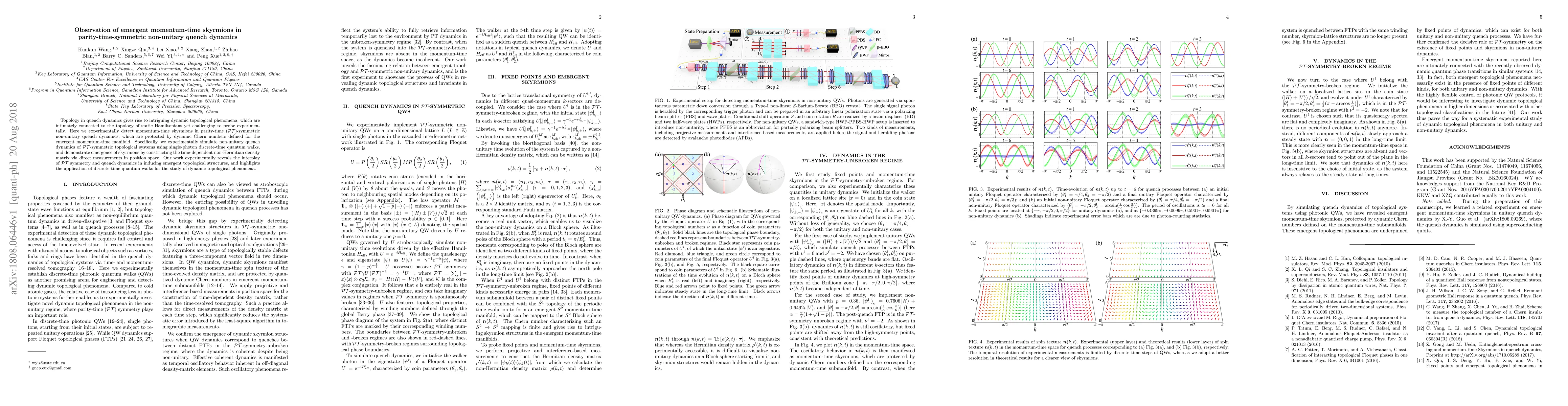 This paper experimentally observes momentum-time skyrmions in PT-symmetric non-unitary quench dynamics using single-photon discrete-time quantum walks, demonstrating the emergence of topological structures protected by dynamic Chern numbers. The study highlights the interplay between PT symmetry and quench dynamics in creating dynamic topological phenomena.
