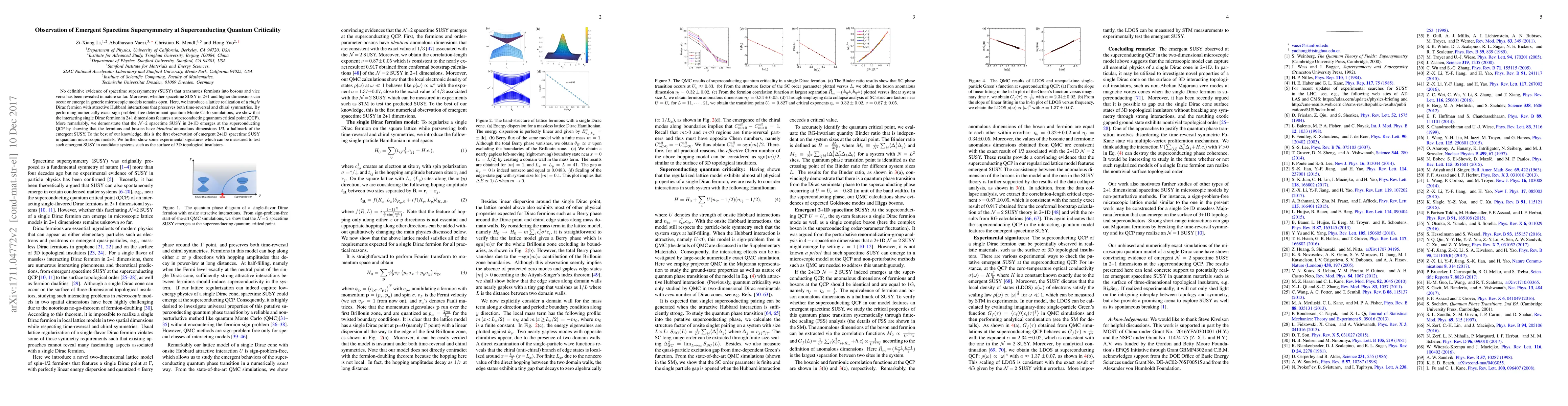 This paper reports the first observation of emergent spacetime supersymmetry in a lattice model of a single Dirac fermion with superconducting quantum criticality, demonstrating identical anomalous dimensions for fermions and bosons. Experimental signatures are proposed for testing this emergent SUSY in systems like 3D topological insulators.