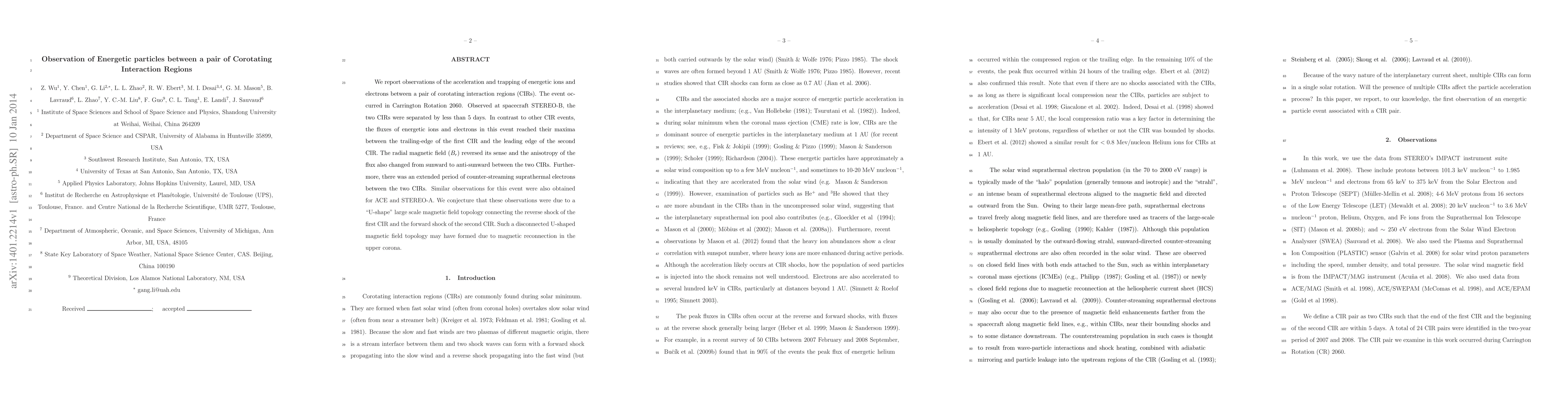 We report observations of the acceleration and trapping of energetic ions and electrons between a pair of corotating interaction regions (CIRs). The event occurred in Carrington Rotation 2060. Observed at spacecraft STEREO-B, the two CIRs were separated by less than 5 days. In contrast to other CIR events, the fluxes of energetic ions and electrons in this event reached their maxima between the trailing-edge of the first CIR and the leading edge of the second CIR. The radial magnetic field (Br) reversed its sense and the anisotropy of the flux also changed from sunward to anti-sunward between the two CIRs. Furthermore, there was an extended period of counter-streaming suprathermal electrons between the two CIRs. Similar observations for this event were also obtained for ACE and STEREO-A. We conjecture that these observations were due to a "U-shape" large scale magnetic field topology connecting the reverse shock of the first CIR and the forward shock of the second CIR. Such a disconnected U-shaped magnetic field topology may have formed due to magnetic reconnection in the upper corona.