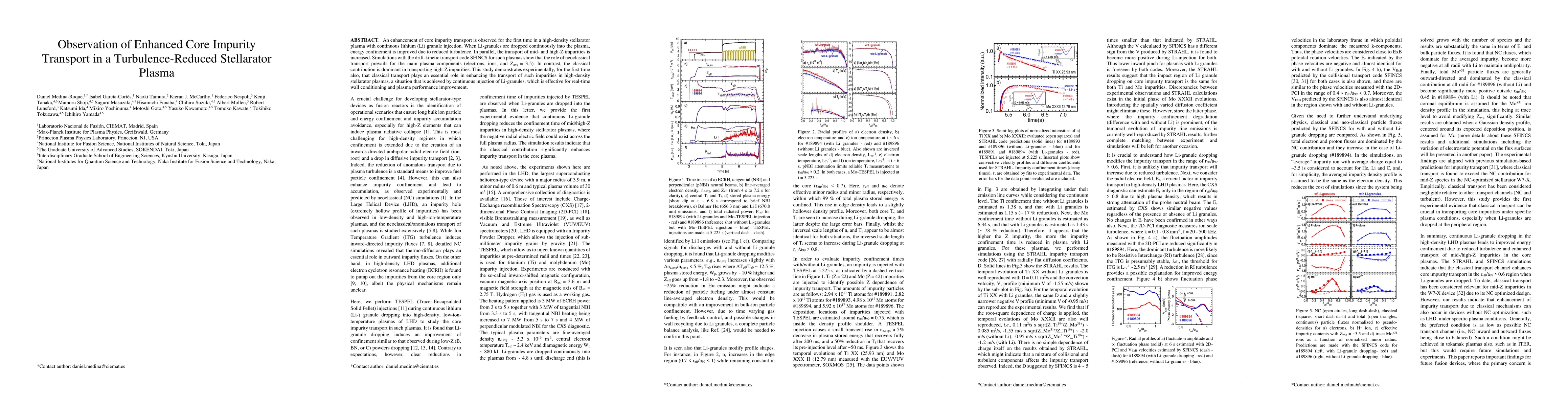 An enhancement of core impurity transport is observed for the first time in a high-density stellarator plasma with continuous lithium (Li) granule injection. When Li-granules are dropped continuously into the plasma, energy confinement is improved due to reduced turbulence. In parallel, the transport of mid- and high-Z impurities is increased. Simulations with the drift-kinetic transport code SFINCS for such plasmas show that the role of neoclassical transport prevails for the main plasma components (electrons, ions, and Zavg = 3.5). In contrast, the classical contribution is dominant in transporting high-Z impurities. This study demonstrates experimentally, for the first time also, that classical transport plays an essential role in enhancing the transport of such impurities in high-density stellarator plasmas, a situation that is achieved by continuous injection of Li-granules, which is effective for real-time wall conditioning and plasma performance improvement