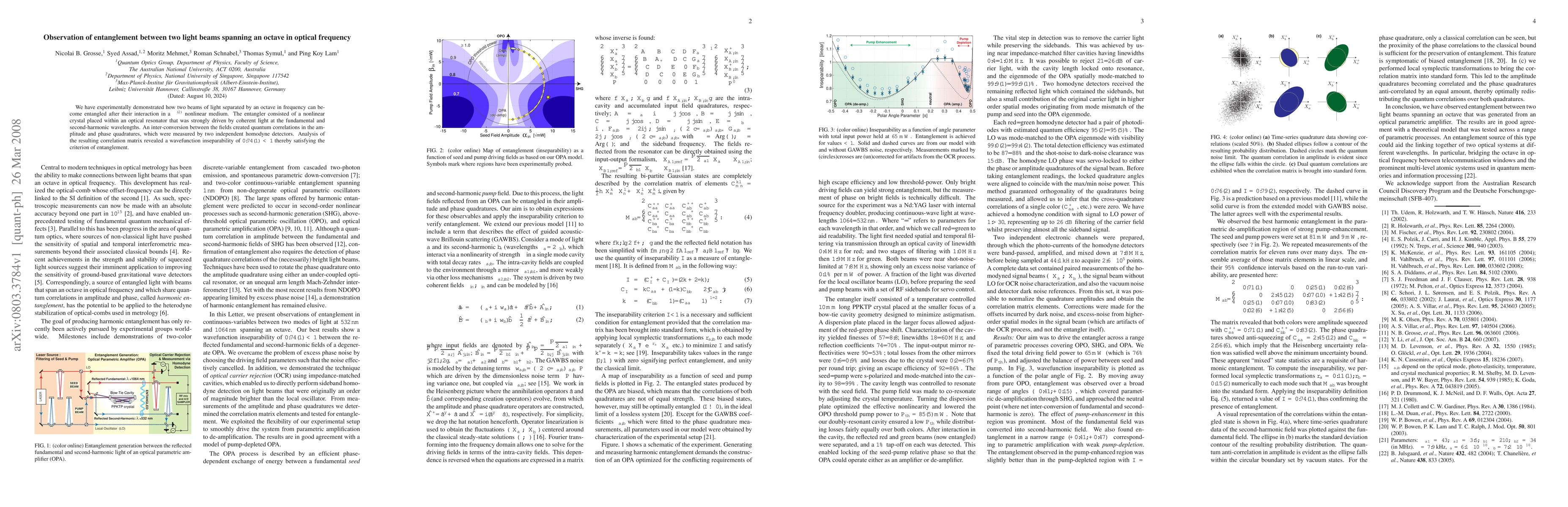 We have experimentally demonstrated how two beams of light separated by an octave in frequency can become entangled after their interaction in a second-order nonlinear medium. The entangler consisted of a nonlinear crystal placed within an optical resonator that was strongly driven by coherent light at the fundamental and second-harmonic wavelengths. An inter-conversion between the fields created quantum correlations in the amplitude and phase quadratures, which were measured by two independent homodyne detectors. Analysis of the resulting correlation matrix revealed a wavefunction inseparability of 0.74(1) < 1 thereby satisfying the criterion of entanglement.