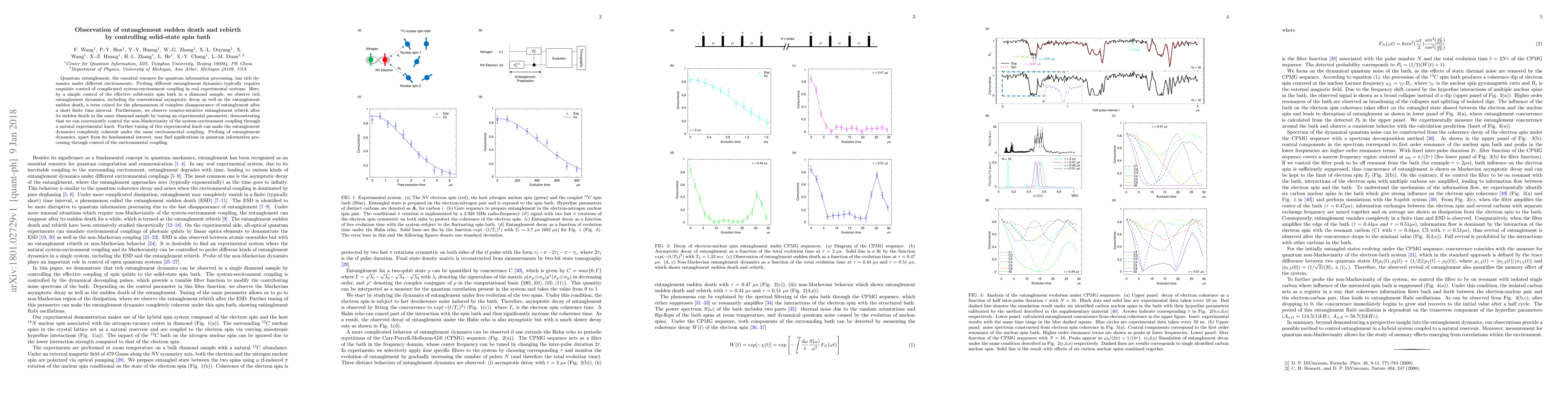 This paper observes entanglement sudden death and rebirth in a diamond sample by controlling the effective solid-state spin bath, demonstrating the ability to manipulate non-Markovianity and coherence in entanglement dynamics, which has potential implications for quantum information processing.