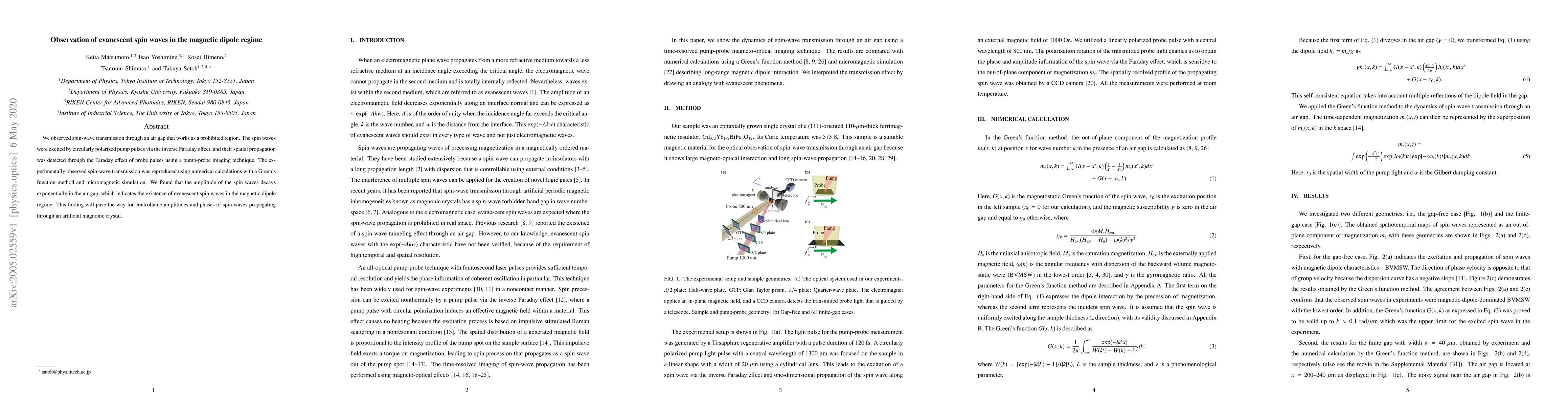 We observed spin-wave transmission through an air gap that works as a prohibited region. The spin waves were excited by circularly polarized pump pulses via the inverse Faraday effect, and their spatial propagation was detected through the Faraday effect of probe pulses using a pump-probe imaging technique. The experimentally observed spin-wave transmission was reproduced using numerical calculations with a Green's function method and micromagnetic simulation. We found that the amplitude of the spin waves decays exponentially in the air gap, which indicates the existence of evanescent spin waves in the magnetic dipole regime. This finding will pave the way for controllable amplitudes and phases of spin waves propagating through an artificial magnonic crystal.