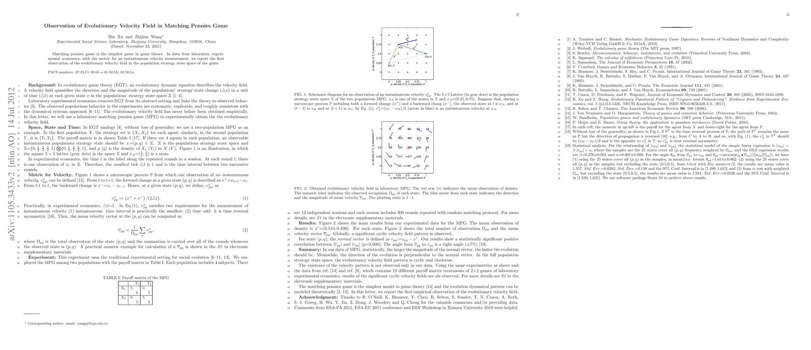Summary: This study observes the evolutionary velocity field in a matching pennies game using experimental economics, providing the first measurement of instantaneous velocity in the population strategy state space. The findings reveal dynamic changes in player strategies over time.