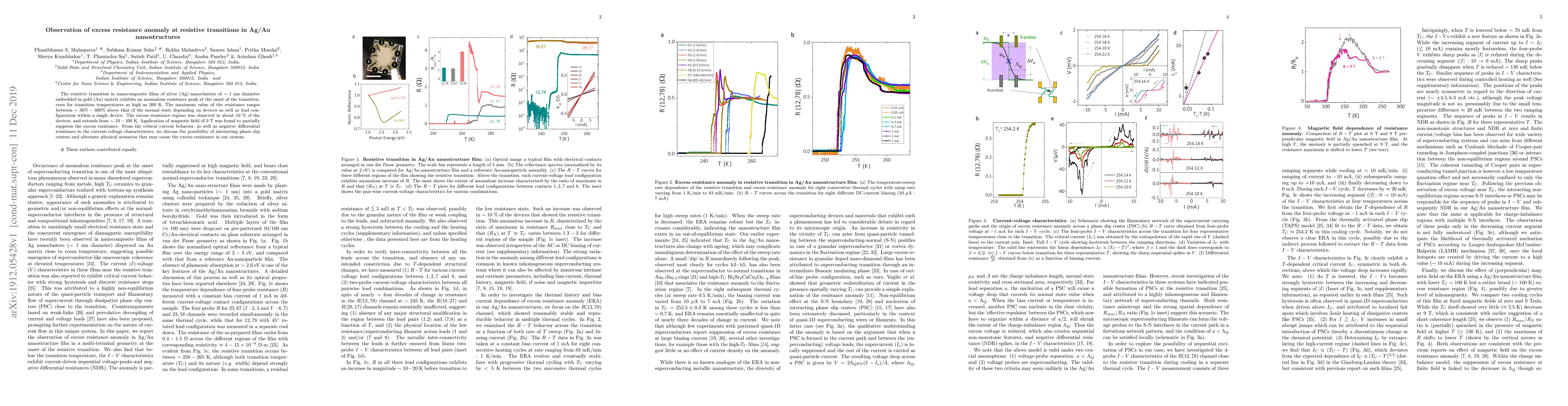 This study observes an anomalous resistance peak in Ag/Au nanostructure films at the onset of resistive transitions, with resistance values up to 300% above normal levels. The phenomenon occurs in about 10% of devices and is partially suppressed by a 9 T magnetic field, suggesting potential interacting phase slip centers or other mechanisms.