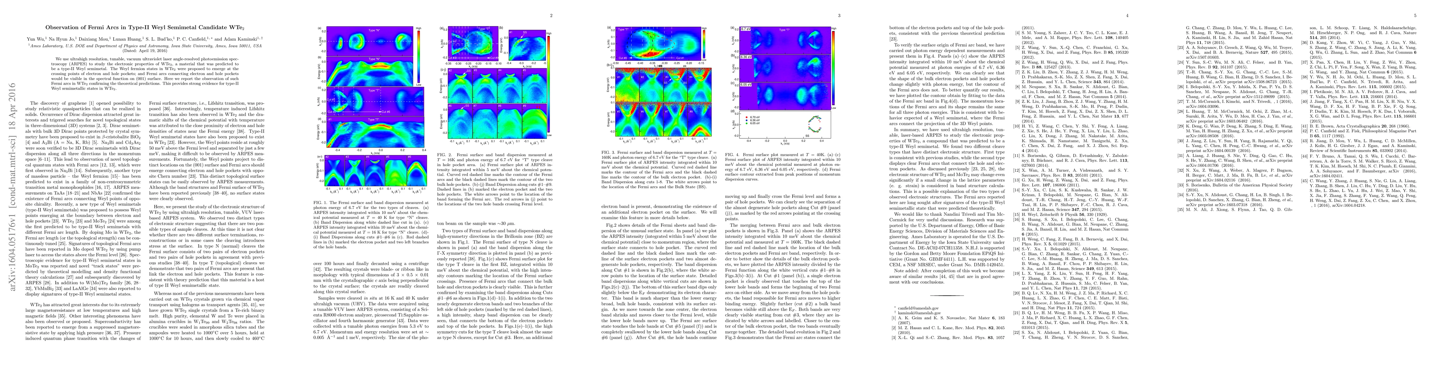 This study employs ultrahigh resolution ARPES to investigate WTe2, confirming the presence of Fermi arcs, which validates theoretical predictions of type-II Weyl semimetal characteristics in WTe2.