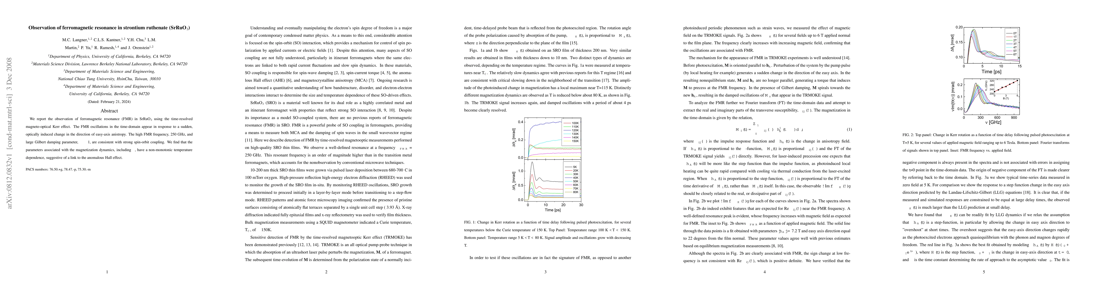 The paper reports the observation of ferromagnetic resonance (FMR) in SrRuO3 using time-resolved magneto-optical Kerr effect. High FMR frequency of 250 GHz and large Gilbert damping parameter (~1) indicate strong spin-orbit coupling. The study finds non-monotonic temperature dependence in magnetization dynamics parameters, suggesting a connection to the anomalous Hall effect.
