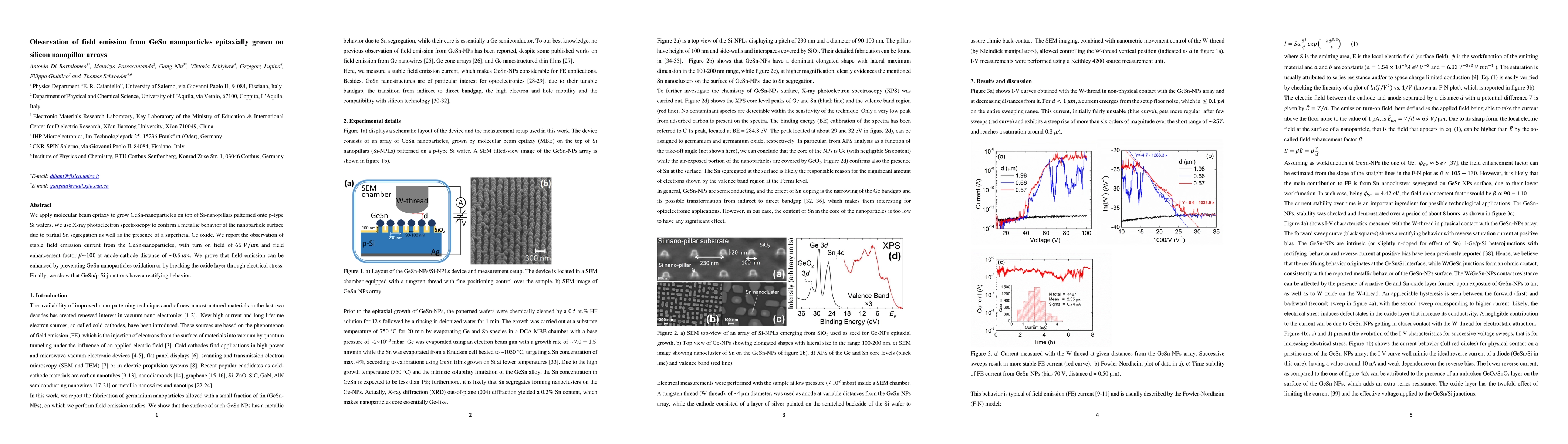 The paper details growing GeSn nanoparticles on Si nanopillars using molecular beam epitaxy, confirmed metallic surface via X-ray spectroscopy, and observing stable field emission. Enhanced emission by preventing oxidation or breaking oxide layers, and rectifying behavior at GeSn/p-Si junctions are reported.
