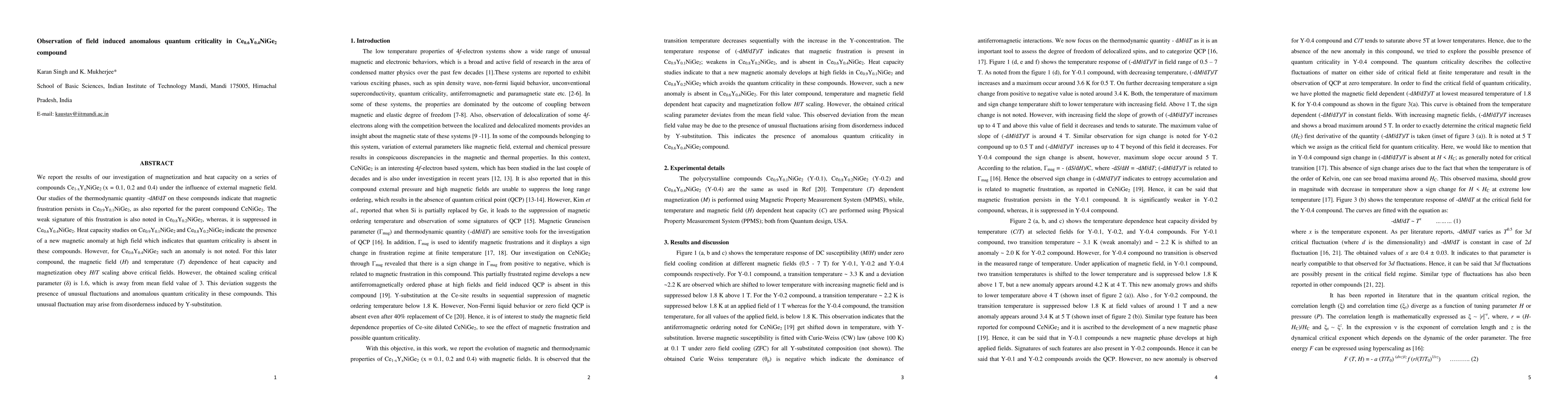 Researchers observed anomalous quantum criticality in a cerium-yttrium-nickel germanium compound under external magnetic field conditions, with scaling critical parameter deviating from mean field value of 3.