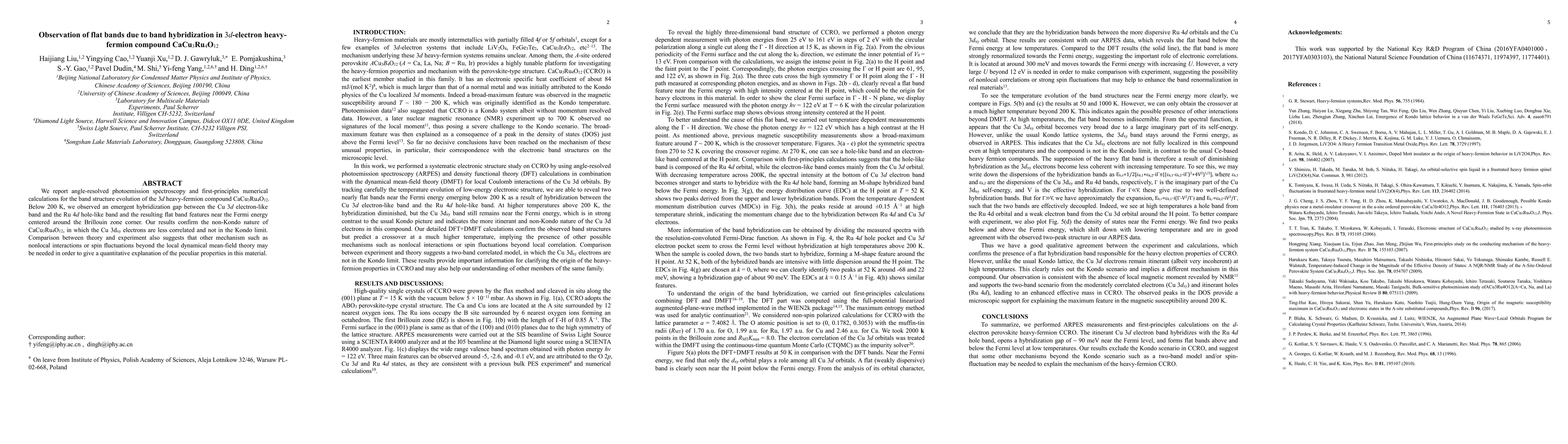 We report angle-resolved photoemission spectroscopy and first-principles numerical calculations for the band structure evolution of the 3d heavy-fermion compound CaCu3Ru4O12. Below 200 K, we observed an emergent hybridization gap between the Cu 3d electron-like band and the Ru 4d hole-like band and the resulting flat band features near the Fermi energy centered around the Brillouin zone corner. Our results confirm the non-Kondo nature of CaCu3Ru4O12, in which the Cu 3dxy electrons are less correlated and not in the Kondo limit. Comparison between theory and experiment also suggests that other mechanism such as nonlocal interactions or spin fluctuations beyond the local dynamical mean-field theory may be needed in order to give a quantitative explanation of the peculiar properties in this material.