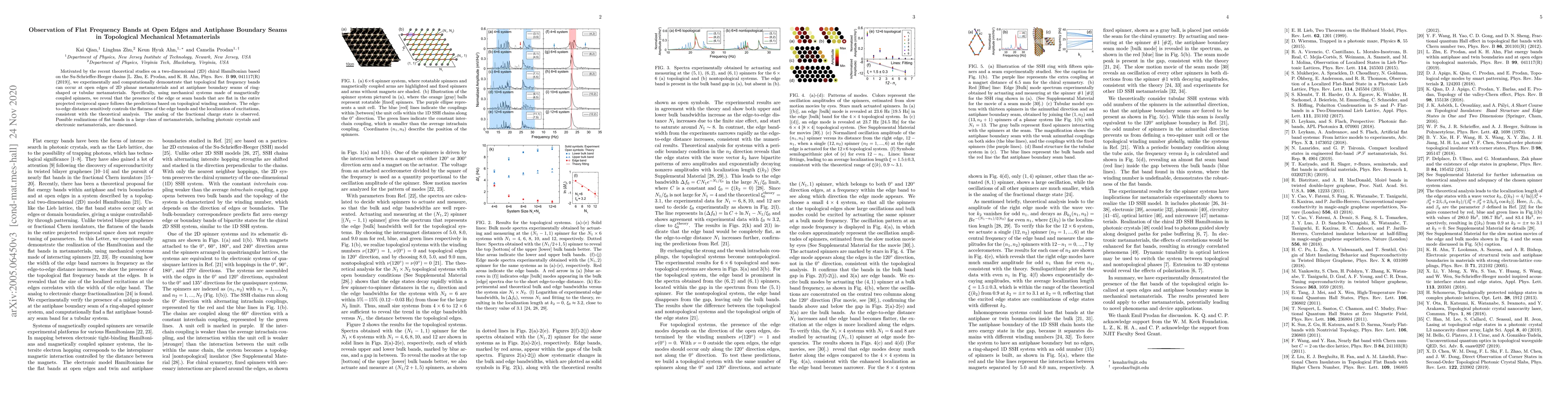 This paper experimentally and computationally demonstrates topological flat frequency bands in 2D mechanical metamaterials at open edges and antiphase boundary seams, confirming theoretical predictions based on topological winding numbers. The study uses magnetically coupled spinners to reveal the control of edge-to-edge distance over the flatness and localization of these bands, and discusses potential applications in various metamaterials.
