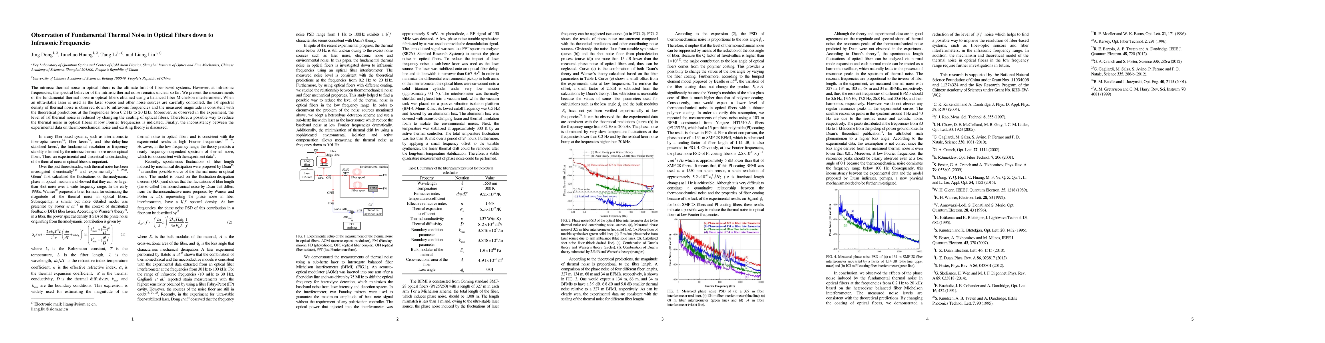 The research presents measurements of intrinsic thermal noise in optical fibers using a balanced fiber Michelson interferometer, observing 1/f spectral density down to infrasonic frequencies (0.2 Hz to 20 kHz) consistent with theory. The study also finds that changing fiber coatings reduces thermal noise, indicating a potential mitigation method, while noting inconsistencies between experimental data and existing theory on thermomechanical noise.