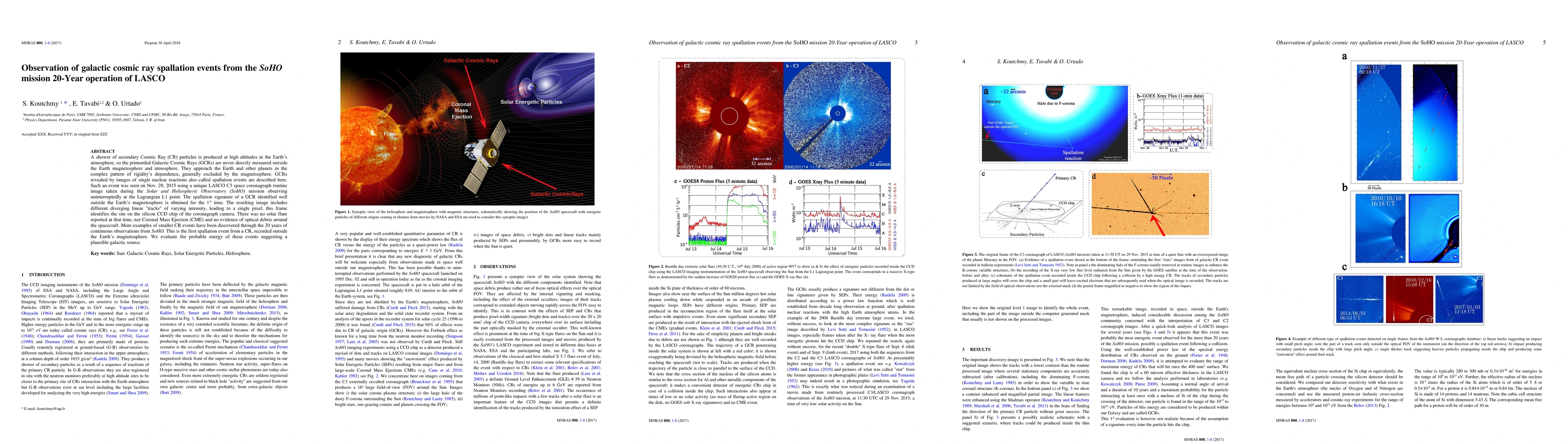 A shower of secondary Cosmic Ray (CR) particles is produced at high altitudes in the Earth's atmosphere, so the primordial Galactic Cosmic Rays (GCRs) are never directly measured outside the Earth magnetosphere and atmosphere. They approach the Earth and other planets in the complex pattern of rigidity's dependence, generally excluded by the magnetosphere. GCRs revealed by images of single nuclear reactions also called spallation events are described here. Such an event was seen on Nov. 29, 2015 using a unique LASCO C3 space coronagraph routine image taken during the Solar and Heliospheric Observatory (SoHO) mission observing uninterruptedly at the Lagrangian L1 point. The spallation signature of a GCR identified well outside the Earth's magnetosphere is obtained for the 1st time. The resulting image includes different diverging linear "tracks" of varying intensity, leading to a single pixel, this frame identifies the site on the silicon CCD chip of the coronagraph camera. There was no solar flare reported at that time, nor Coronal Mass Ejection (CME) and no evidence of optical debris around the spacecraft. More examples of smaller CR events have been discovered through the 20 years of continuous observations from SoHO. This is the first spallation event from a CR, recorded outside the Earth's magnetosphere. We evaluate the probable energy of these events suggesting a plausible galactic source. Key words: Sun: Galactic Cosmic Rays, Solar Energetic Particles, Heliosphere.