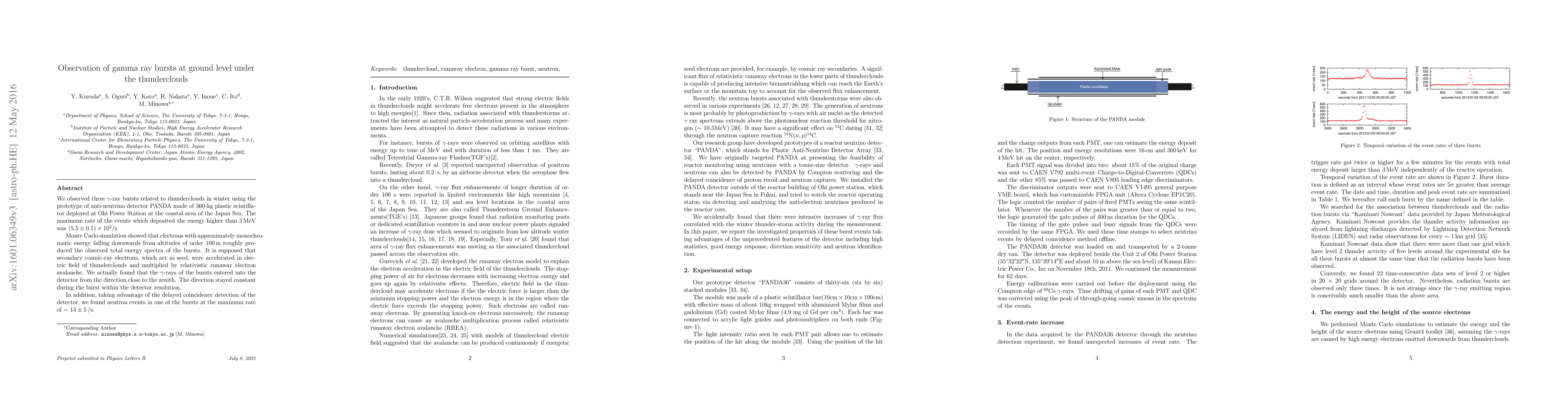 We observed three $\gamma$-ray bursts related to thunderclouds in winter using the prototype of anti-neutrino detector PANDA made of 360-kg plastic scintillator deployed at Ohi Power Station at the coastal area of the Japan Sea. The maximum rate of the events which deposited the energy higher than $3\,$MeV was $(5.5 \pm 0.1) \times 10^2 {\rm /s}$. Monte Carlo simulation showed that electrons with approximately monochromatic energy falling downwards from altitudes of order $100\,$m roughly produced the observed total energy spectra of the bursts. It is supposed that secondary cosmic-ray electrons, which act as seed, were accelerated in electric field of thunderclouds and multiplied by relativistic runaway electron avalanche. We actually found that the $\gamma$-rays of the bursts entered into the detector from the direction close to the zenith. The direction stayed constant during the burst within the detector resolution. In addition, taking advantage of the delayed coincidence detection of the detector, we found neutron events in one of the bursts at the maximum rate of $\sim 14\pm5\,{\rm /s}$.