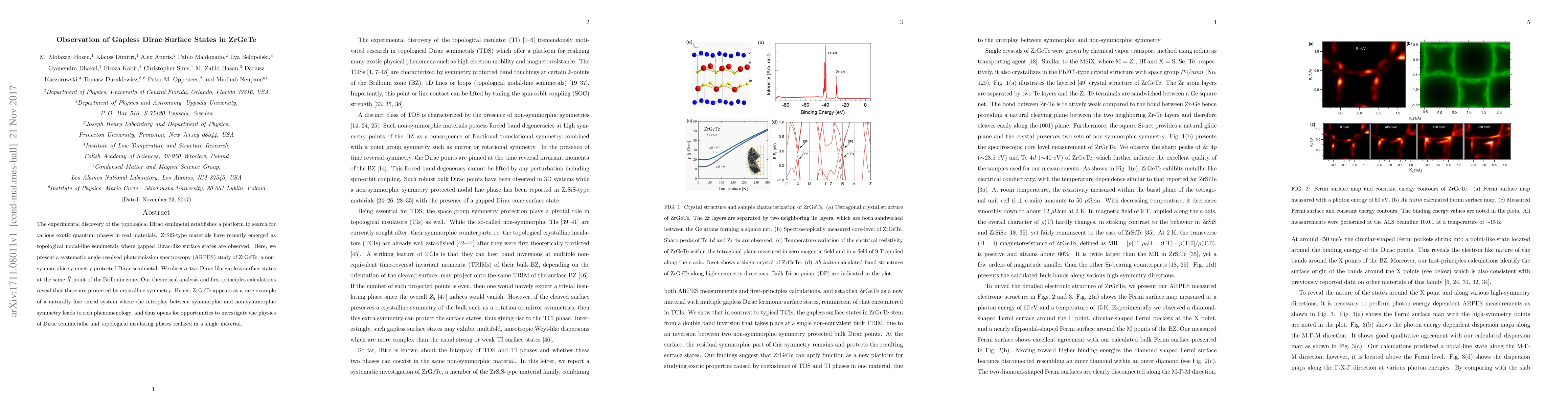 This paper reports the observation of gapless Dirac surface states in ZrGeTe using angle-resolved photoemission spectroscopy, revealing its status as a nonsymmorphic symmetry protected Dirac semimetal. The findings suggest a naturally fine-tuned system where symmorphic and non-symmorphic symmetries interact, offering new avenues for studying Dirac semimetals and topological insulating phases.