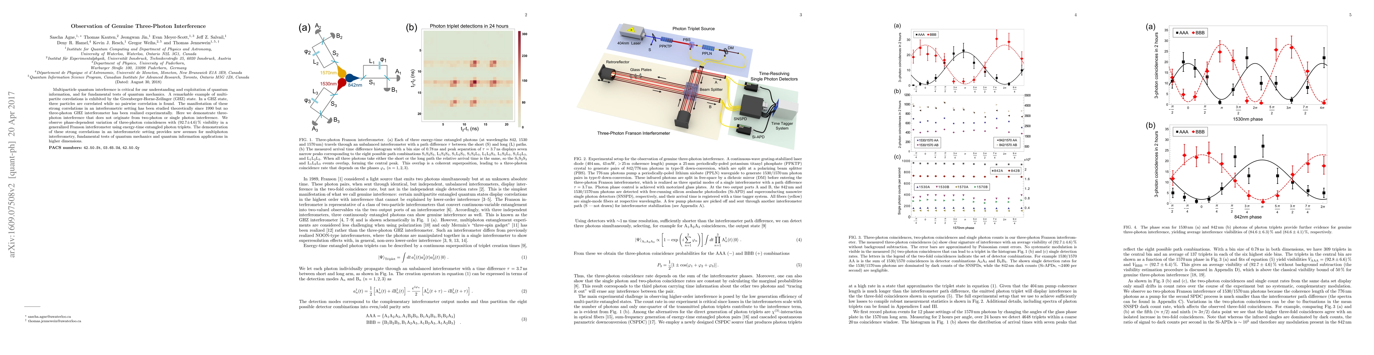 This paper reports the first experimental observation of genuine three-photon interference using energy-time entangled photon triplets in a Franson interferometer, demonstrating 90.5% visibility and providing new insights for quantum information and fundamental tests of quantum mechanics.