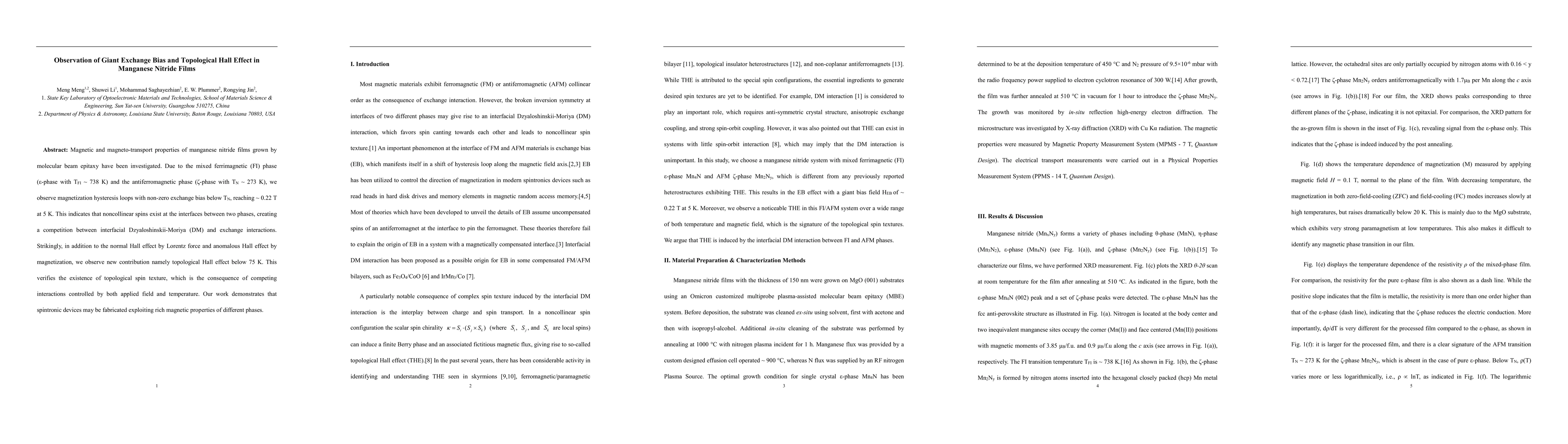 Magnetic and magneto-transport properties of manganese nitride films grown by molecular beam epitaxy have been investigated. Due to the mixed ferrimagnetic (FI) phase (${\epsilon}$-phase with TFI ~ 738 K) and the antiferromagnetic phase (${\zeta}$-phase with TN ~ 273 K), we observe magnetization hysteresis loops with non-zero exchange bias below TN, reaching ~ 0.22 T at 5 K. This indicates that noncollinear spins exist at the interfaces between two phases, creating a competition between interfacial Dzyaloshinskii-Moriya (DM) and exchange interactions. Strikingly, in addition to the normal Hall effect by Lorentz force and anomalous Hall effect by magnetization, we observe new contribution namely topological Hall effect below 75 K. This verifies the existence of topological spin texture, which is the consequence of competing interactions controlled by both applied field and temperature. Our work demonstrates that spintronic devices may be fabricated exploiting rich magnetic properties of different phases.