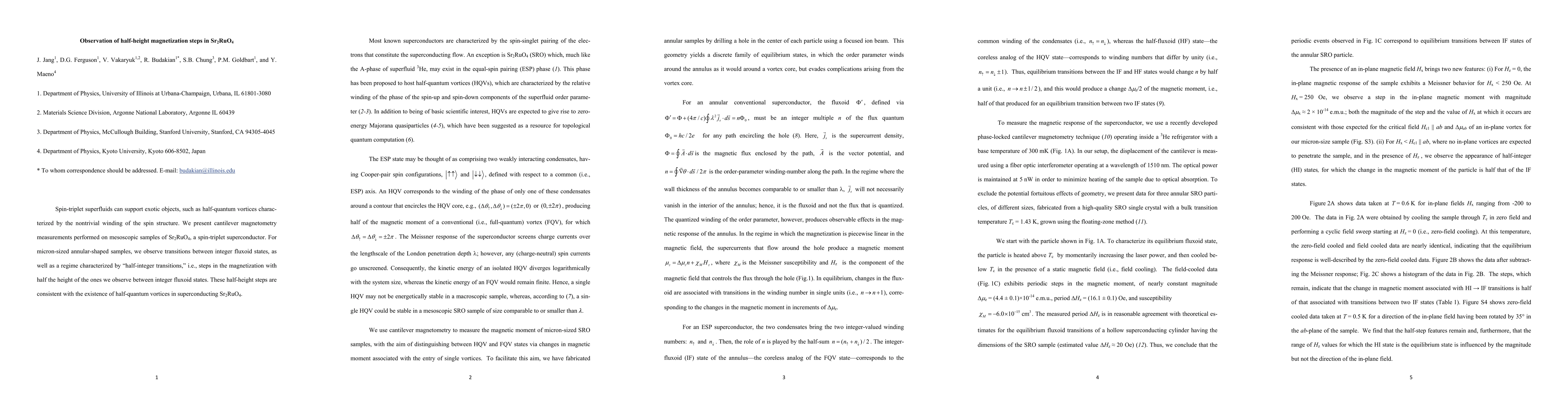 Spin-triplet superfluids can support exotic objects, such as half-quantum vortices characterized by the nontrivial winding of the spin structure. We present cantilever magnetometry measurements performed on mesoscopic samples of Sr2RuO4, a spin-triplet superconductor. For micron-sized annular-shaped samples, we observe transitions between integer fluxoid states, as well as a regime characterized by "half-integer transitions," i.e., steps in the magnetization with half the height of the ones we observe between integer fluxoid states. These half-height steps are consistent with the existence of half-quantum vortices in superconducting Sr2RuO4.