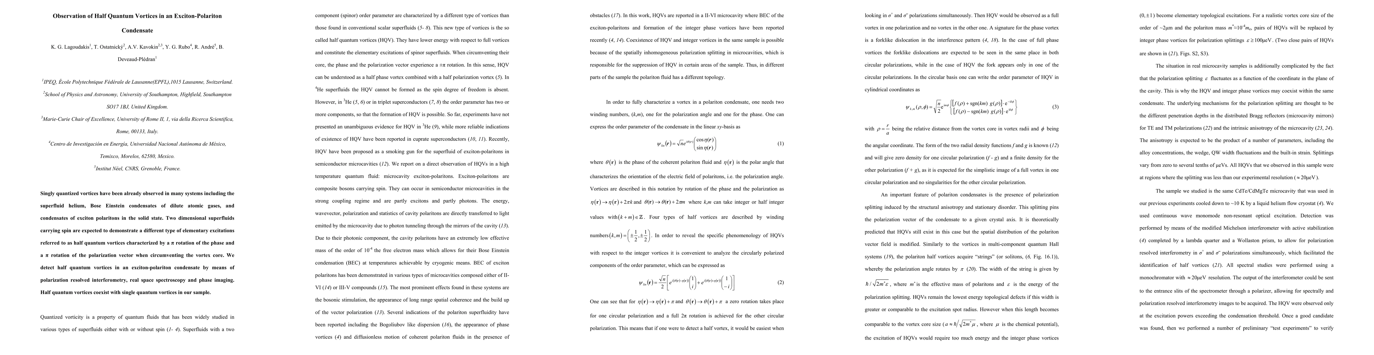 This study observes half quantum vortices in an exciton-polariton condensate using polarization resolved interferometry, real space spectroscopy, and phase imaging. These half quantum vortices, characterized by a π rotation of both phase and polarization, coexist with single quantum vortices in the sample.