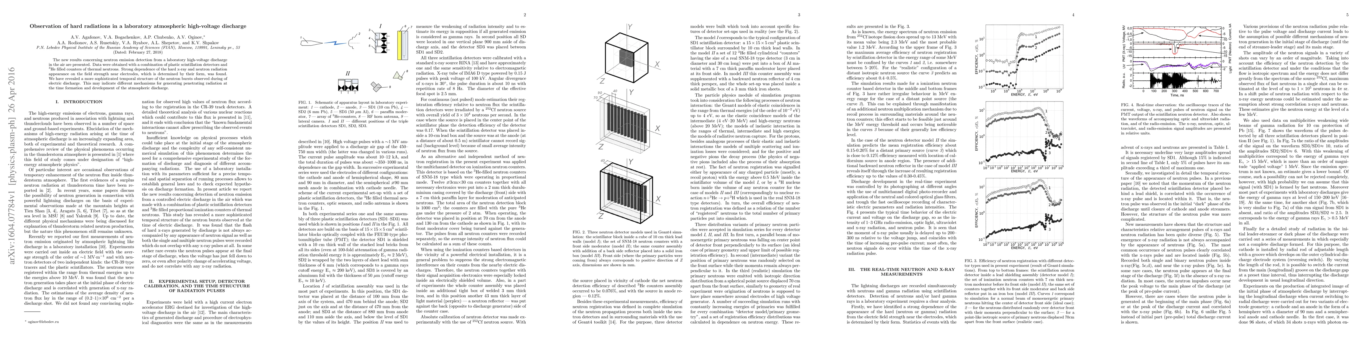 The new results concerning neutron emission detection from a laboratory high-voltage discharge in the air are presented. Data were obtained with a combination of plastic scintillation detectors and $^3$He filled counters of thermal neutrons. Strong dependence of the hard x-ray and neutron radiation appearance on the field strength near electrodes, which is determined by their form, was found. We have revealed a more sophisticated temporal structure of the neutron bursts observed during of electric discharge. This may indicate different mechanisms for generating penetrating radiation at the time formation and development of the atmospheric discharge.