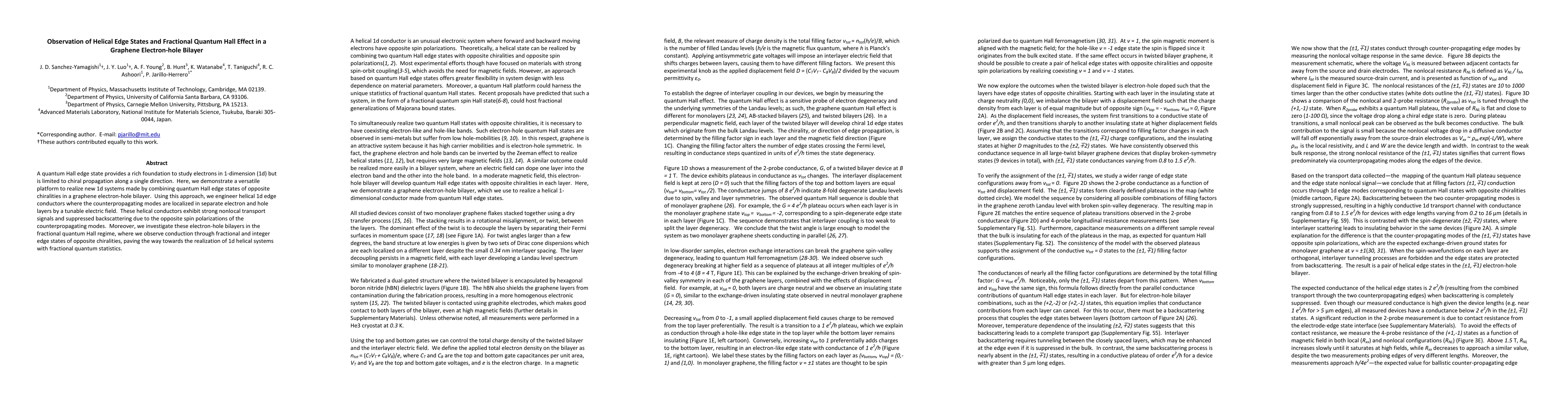 This research demonstrates the creation of helical edge states in a graphene electron-hole bilayer, achieving counterpropagating modes in separate layers via an electric field, which shows nonlocal transport and suppressed backscattering. The study also observes the fractional quantum Hall effect within these bilayers, highlighting the potential for 1D systems with fractional quantum statistics.