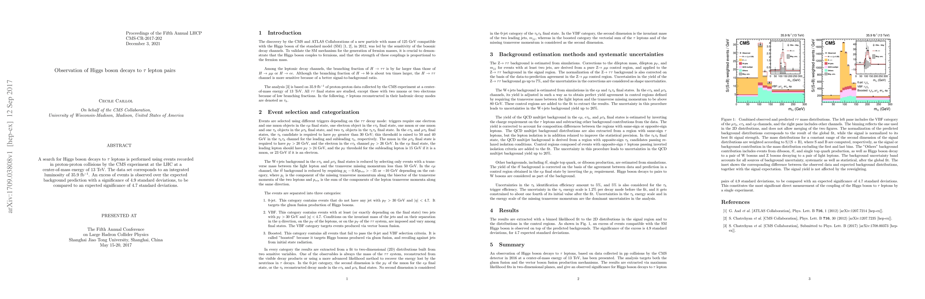 A search for Higgs boson decays to $\tau$ leptons is performed using events recorded in proton-proton collisions by the CMS experiment at the LHC at a center-of-mass energy of 13 TeV. The data set corresponds to an integrated luminosity of 35.9 $fb^{-1}$. An excess of events is observed over the expected background prediction with a significance of 4.9 standard deviations, to be compared to an expected significance of 4.7 standard deviations.