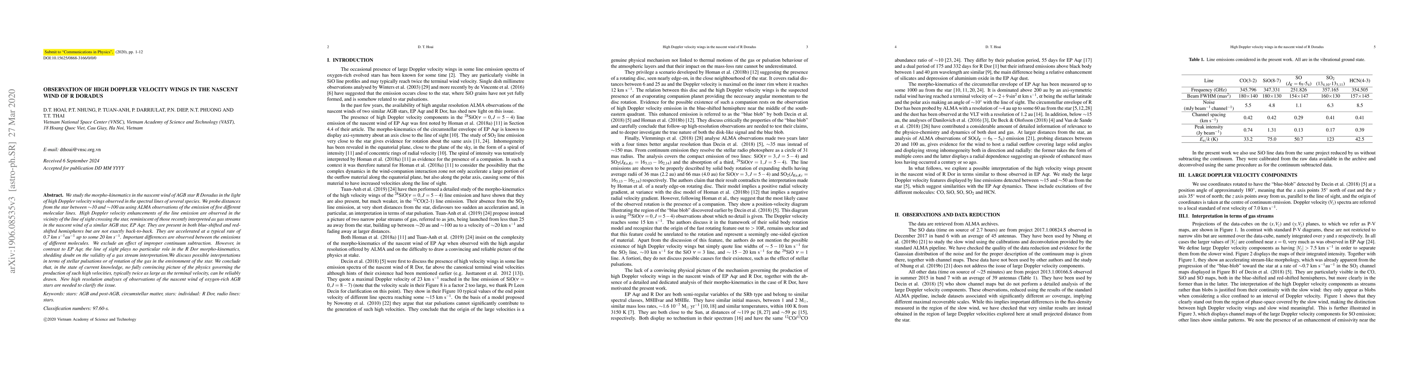 We study the morpho-kinematics in the nascent wind of AGB star R Doradus in the light of high Doppler velocity wings observed in the spectral lines of several species. We probe distances from the star between ~10 and ~100 au using ALMA observations of the emission of five different molecular lines. High Doppler velocity enhancements of the line emission are observed in the vicinity of the line of sight crossing the star, reminiscent of those recently interpreted as gas streams in the nascent wind of a similar AGB star, EP Aqr. They are present in both blue-shifted and red-shifted hemispheres but are not exactly back-to-back. They are accelerated at a typical rate of 0.7 km s$^{-1}$ au$^{-1}$ up to some 20 km s$^{-1}$. Important differences are observed between the emissions of different molecules. We exclude an effect of improper continuum subtraction. However, in contrast to EP Aqr, the line of sight plays no particular role in the R Dor morpho-kinematics, shedding doubt on the validity of a gas stream interpretation.We discuss possible interpretations in terms of stellar pulsations or of rotation of the gas in the environment of the star. We conclude that, in the state of current knowledge, no fully convincing picture of the physics governing the production of such high velocities, typically twice as large as the terminal velocity, can be reliably drawn. New high resolution analyses of observations of the nascent wind of oxygen-rich AGB stars are needed to clarify the issue.
