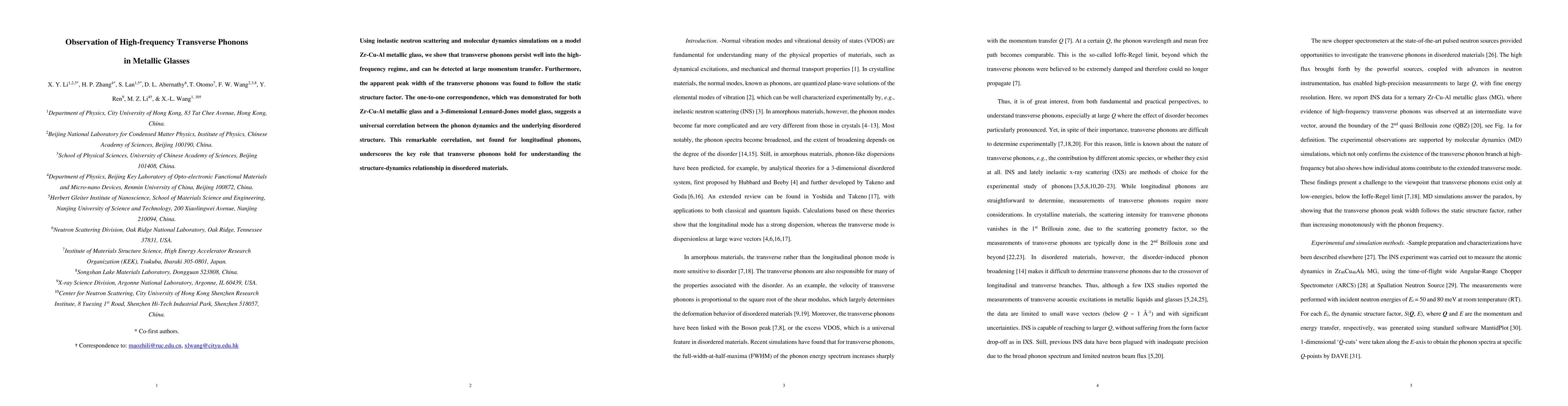 Researchers discovered high-frequency transverse phonons in metallic glasses using neutron scattering and simulations, showing a universal correlation between phonon dynamics and disordered structure. This finding highlights the key role of transverse phonons in understanding material properties.