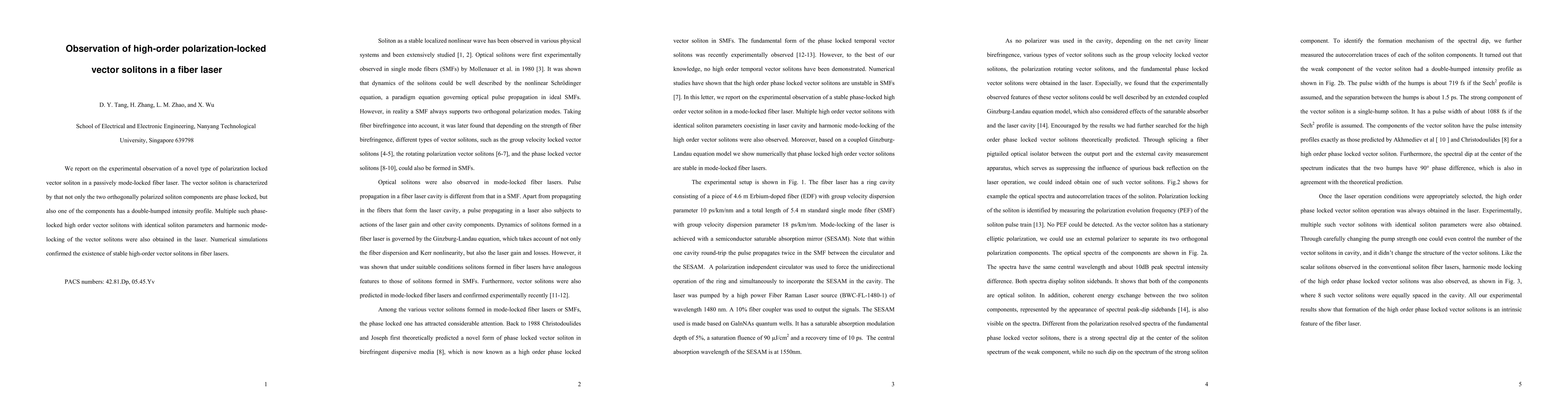 Summary: Researchers observed novel high-order polarization-locked vector solitons in a fiber laser, featuring phase-locked orthogonally polarized components with one displaying a double-humped intensity profile, alongside harmonic mode-locking, confirmed by numerical simulations.