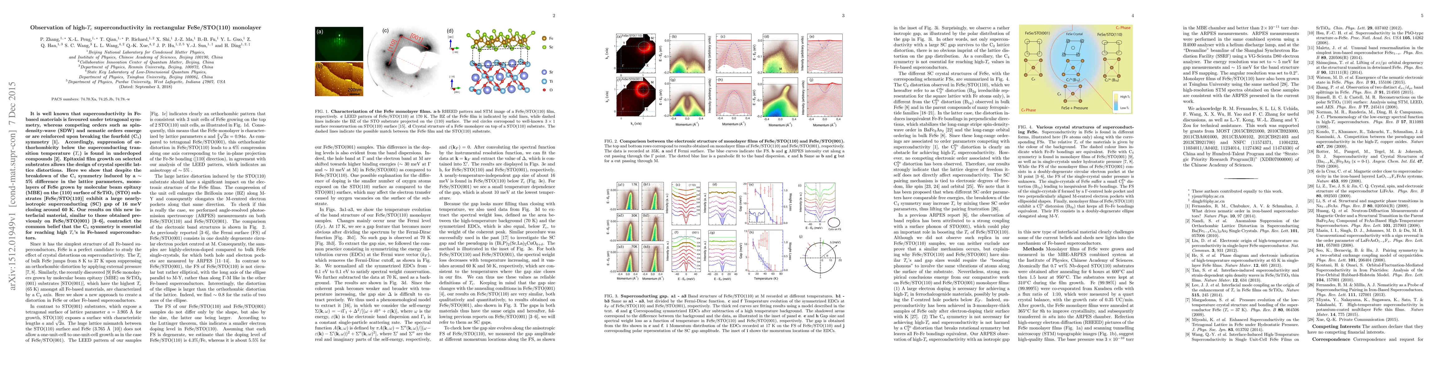 This paper reports high-Tc superconductivity in FeSe monolayers on SrTiO3 (110) substrates, despite breaking the fourfold symmetry, challenging the necessity of C4 symmetry for high-temperature superconductivity in Fe-based materials. The observed isotropic superconducting gap of 16 meV at 60 K suggests new pathways for enhancing superconductivity.