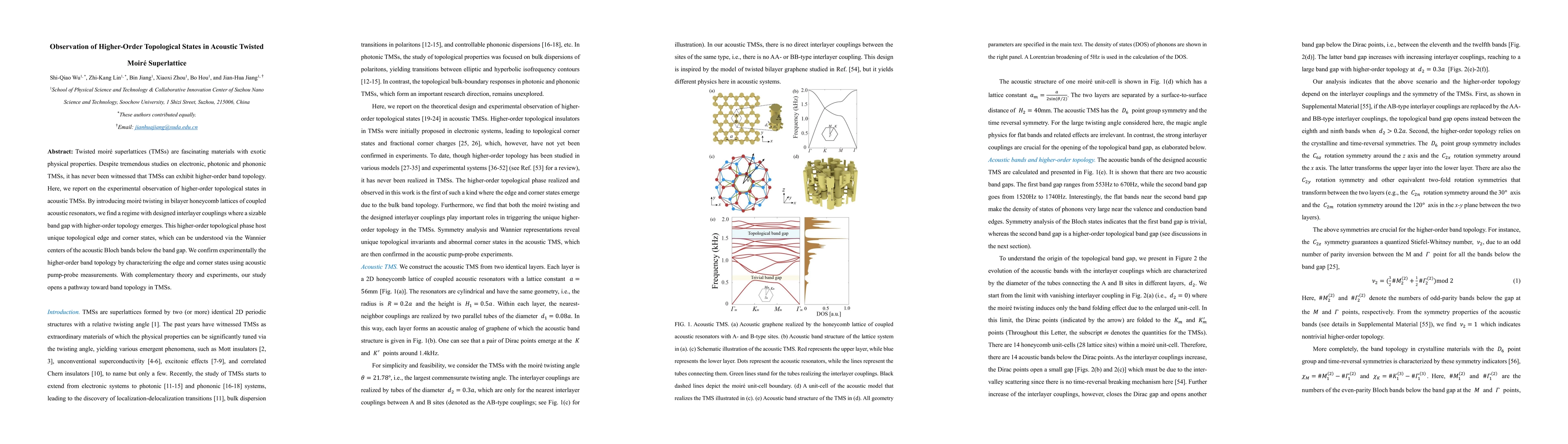 This paper reports the first experimental observation of higher-order topological states in acoustic twisted moiré superlattices, revealing unique topological edge and corner states. The study confirms these states through acoustic pump-probe measurements and provides a pathway for exploring band topology in such materials.