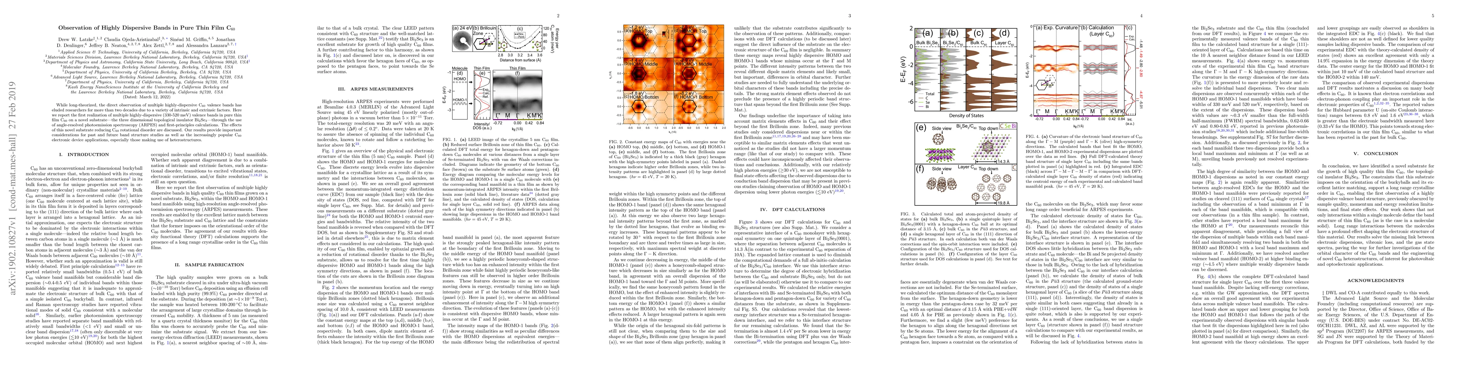 While long-theorized, the direct observation of multiple highly dispersive C$_{60}$ valence bands has eluded researchers for more than two decades due to a variety of intrinsic and extrinsic factors. Here we report a realization of multiple highly dispersive (330-520 meV) valence bands in pure thin film C$_{60}$ on a novel substrate--the three-dimensional topological insulator Bi$_{2}$Se$_{3}$--through the use of angle-resolved photoemission spectroscopy (ARPES) and first-principles calculations. The effects of this novel substrate reducing C$_{60}$ rotational disorder are discussed. Our results provide important considerations for past and future band structure studies as well as the increasingly popular C$_{60}$ electronic device applications, especially those making use of heterostructures.