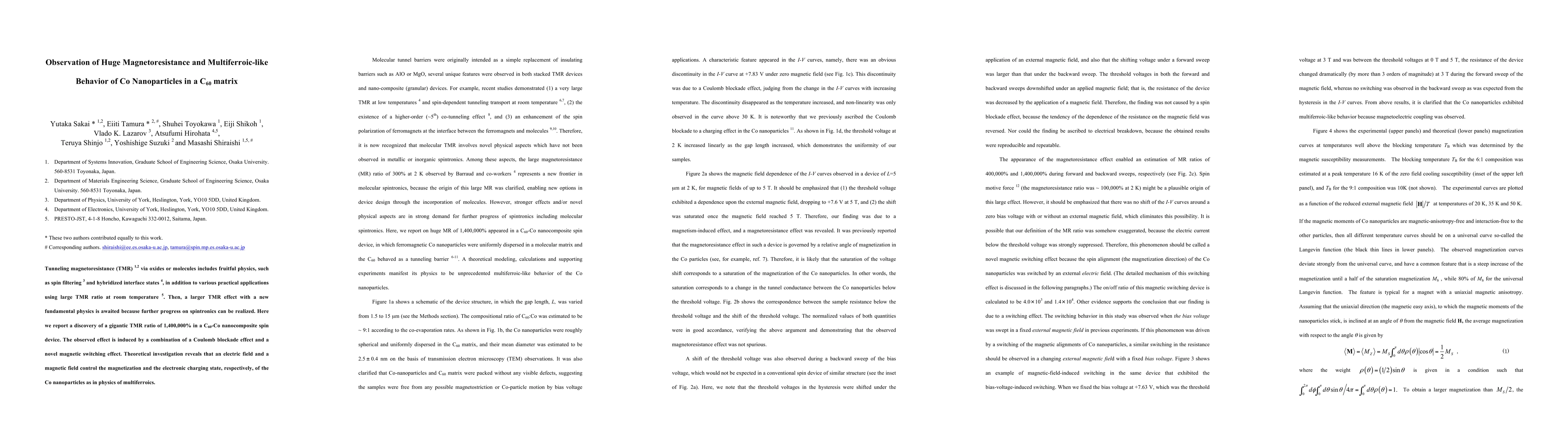 Tunneling magnetoresistance (TMR) via oxides or molecules includes fruitful physics, such as spin filtering and hybridized interface states, in addition to various practical applications using large TMR ratio at room temperature. Then, a larger TMR effect with a new fundamental physics is awaited because further progress on spintronics can be realized. Here we report a discovery of a gigantic TMR ratio of 1,400,000% in a C60-Co nanocomposite spin device. The observed effect is induced by a combination of a Coulomb blockade effect and a novel magnetic switching effect. Theoretical investigation reveals that an electric field and a magnetic field control the magnetization and the electronic charging state, respectively, of the Co nanoparticles as in physics of multiferroicity.