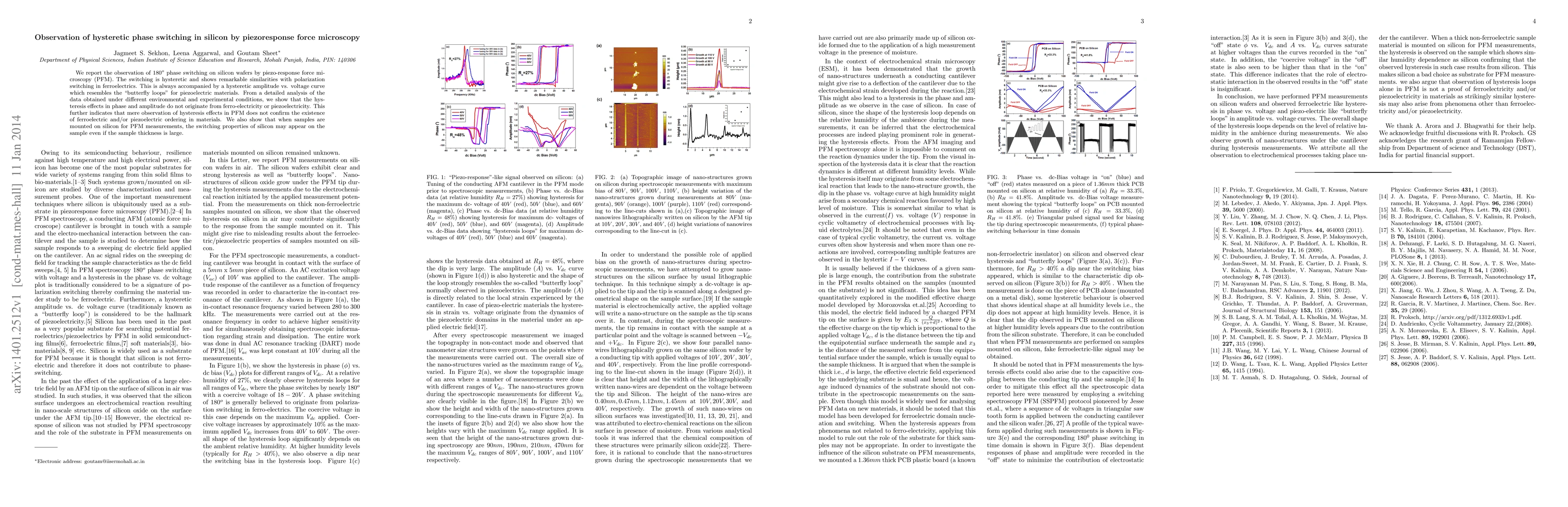 This paper observes hysteretic $180^o$ phase switching in silicon wafers via piezo-response force microscopy, noting similarities to ferroelectric polarization switching. The study concludes that the observed hysteresis does not indicate ferroelectric or piezoelectric properties, emphasizing the need for careful interpretation of PFM data.