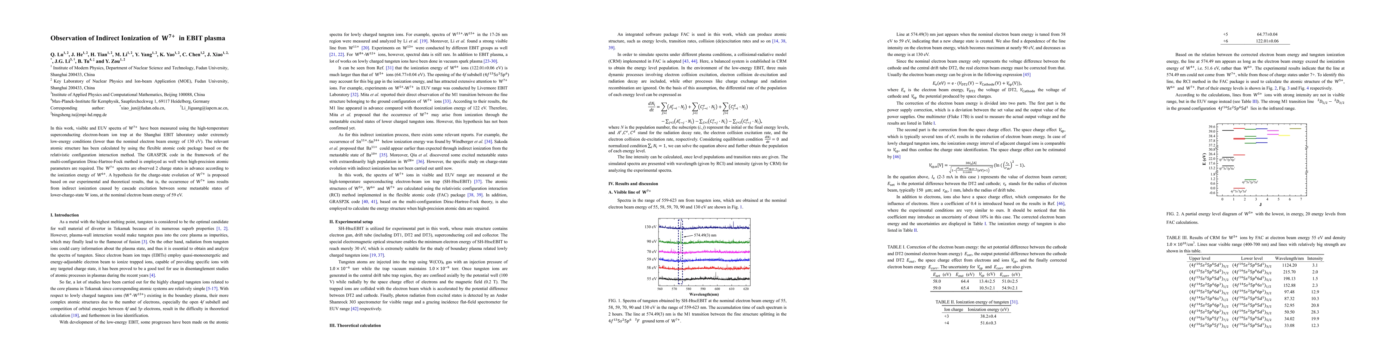 In this work, visible and extreme ultraviolet spectra of W7+ are measured using the high-temperature superconducting electron-beam ion trap (EBIT) at the Shanghai EBIT Laboratory under extremely low-energy conditions (lower than the nominal electron-beam energy of 130 eV). The relevant atomic structure is calculated using the flexible atomic code package based on the relativistic configuration interaction method. The GRASP2K code, in the framework of the multiconfiguration Dirac-Hartree-Fock method, is employed as well for calculating the wavelength of the M1 transition in the ground configuration of W7+. A line from the W7+ ions is observed at a little higher electron-beam energy than the ionization potential for W4+, making this line appear to be from W5+. A hypothesis for the charge-state evolution of W7+ is proposed based on our experimental and theoretical results; that is, the occurrence of W7+ ions results from indirect ionization caused by stepwise excitation between some metastable states of lower-charge-state W ions, at the nominal electron-beam energy of 59 eV.