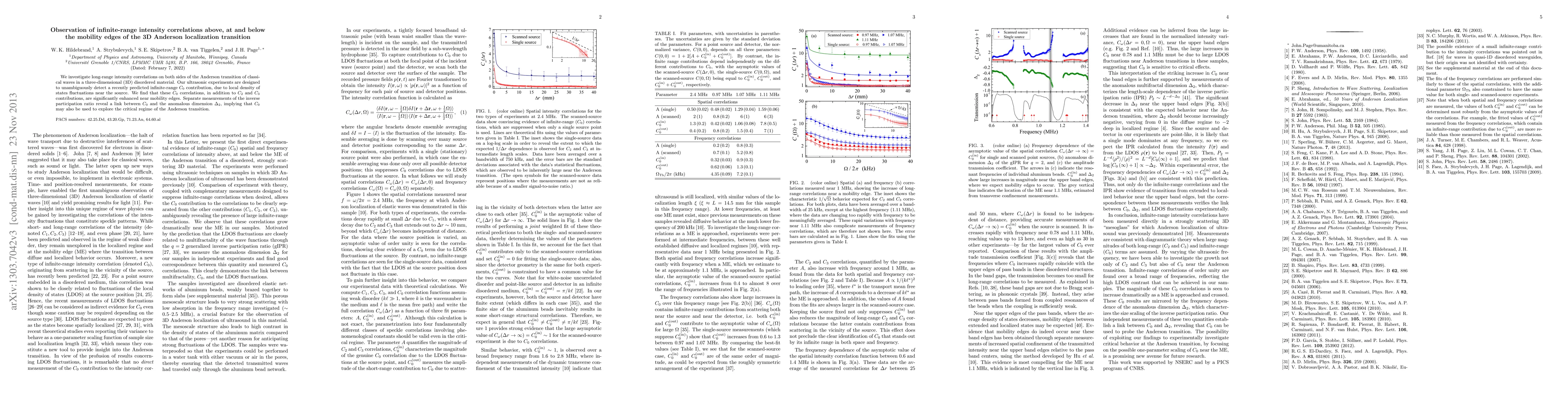 We investigate long-range intensity correlations on both sides of the Anderson transition of classical waves in a three-dimensional (3D) disordered material. Our ultrasonic experiments are designed to unambiguously detect a recently predicted infinite-range C0 contribution, due to local density of states fluctuations near the source. We find that these C0 correlations, in addition to C2 and C3 contributions, are significantly enhanced near mobility edges. Separate measurements of the inverse participation ratio reveal a link between C0 and the anomalous dimension \Delta_2, implying that C0 may also be used to explore the critical regime of the Anderson transition.