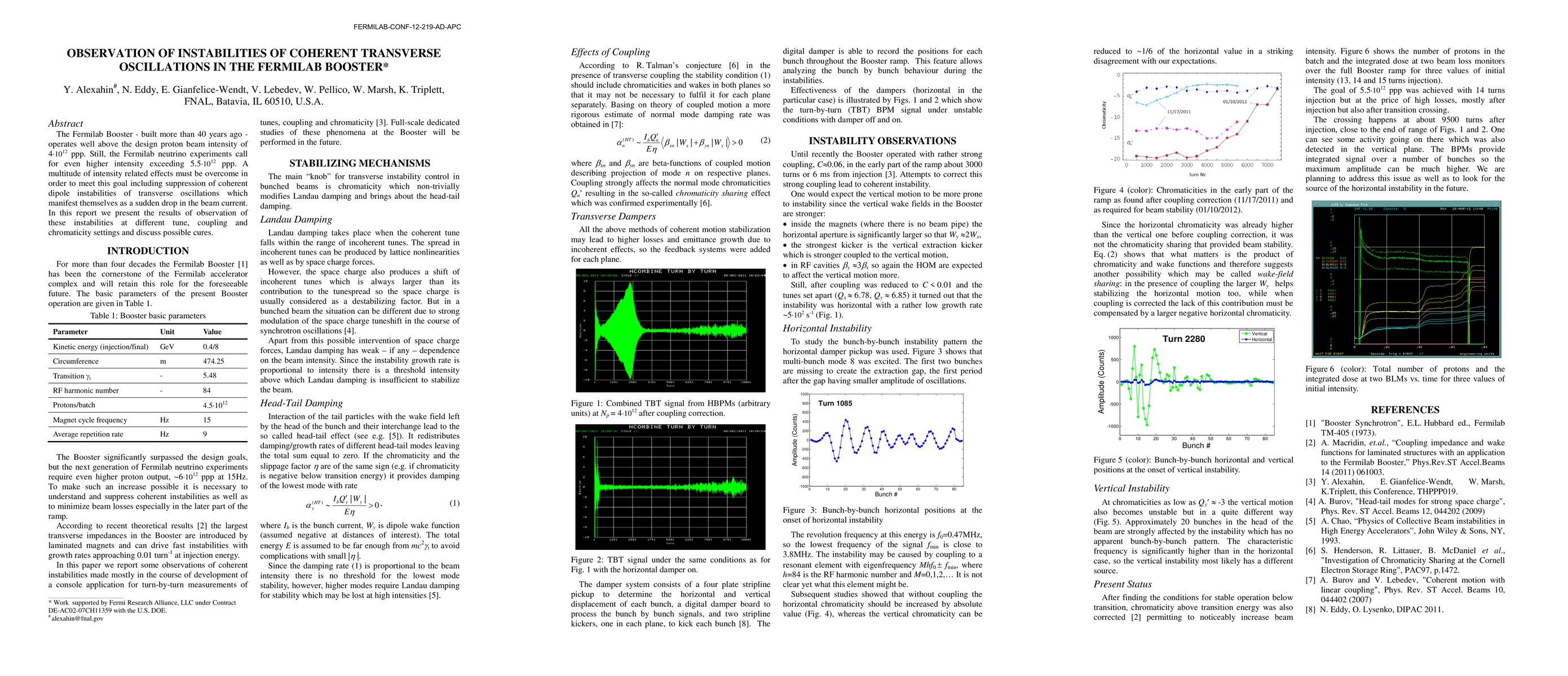 The Fermilab Booster - built more than 40 years ago - operates well above the design proton beam intensity of 4x10**12 ppp. Still, the Fermilab neutrino experiments call for even higher intensity of 5.5x10**12 ppp. A multitude of intensity related effects must be overcome in order to meet this goal including suppression of coherent dipole instabilities of transverse oscillations which manifest themselves as a sudden drop in the beam current. In this report we present the results of observation of these instabilities at different tune, coupling and chromaticity settings and discuss possible cures.