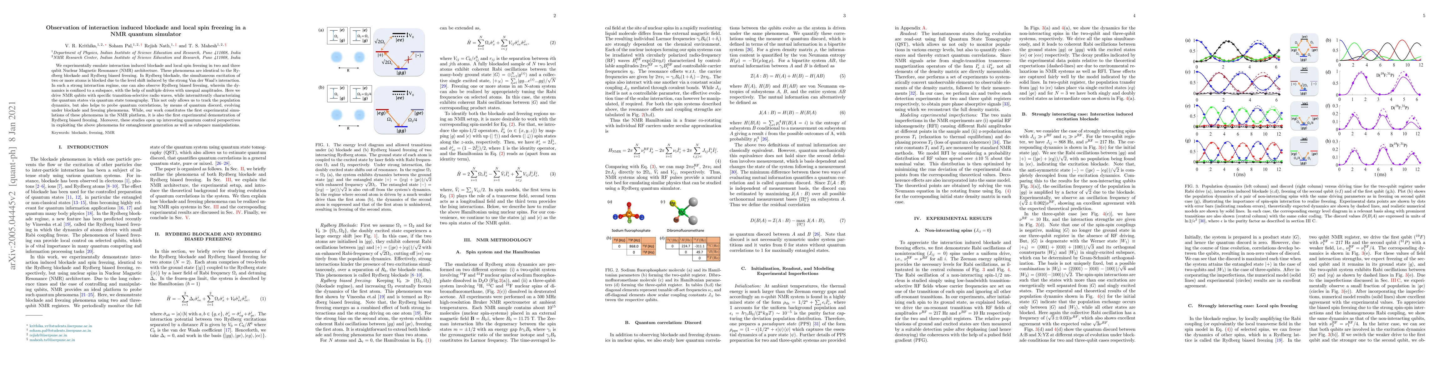 We experimentally emulate interaction induced blockade and local spin freezing in two and three qubit Nuclear Magnetic Resonance (NMR) architecture. These phenomena are identical to the Rydberg blockade and Rydberg biased freezing. In Rydberg blockade, the simultaneous excitation of two or more atoms is blocked due to the level shift induced by the strong Van der Waal's interaction. In such a strong interaction regime, one can also observe Rydberg biased freezing, wherein the dynamics is confined to a subspace, with the help of multiple drives with unequal amplitudes. Here we drive NMR qubits with specific transition-selective radio waves, while intermittently characterizing the quantum states via quantum state tomography. This not only allows us to track the population dynamics, but also helps to probe quantum correlations, by means of quantum discord, evolving under blockade and freezing phenomena. While, our work constitutes the first experimental simulations of these phenomena in the NMR platform, it is also the first experimental demonstration of Rydberg biased freezing. Moreover, these studies open up interesting quantum control perspectives in exploiting the above phenomena for entanglement generation as well as subspace manipulations.