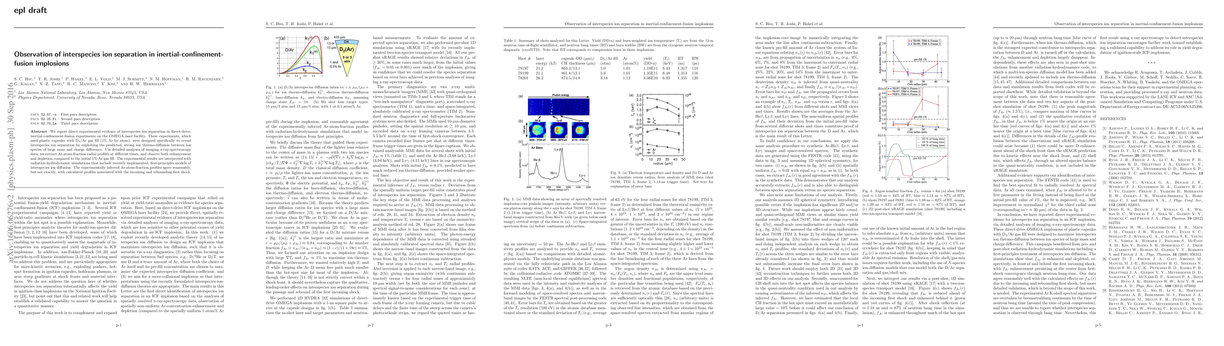 This paper reports direct experimental evidence of interspecies ion separation in inertial-confinement-fusion implosions using the OMEGA laser facility, observing significant changes in Ar-atom-fraction radial profiles due to ion thermo-diffusion. The results are compared with radiation-hydrodynamic simulations incorporating first-principles models of interspecies ion diffusion.
