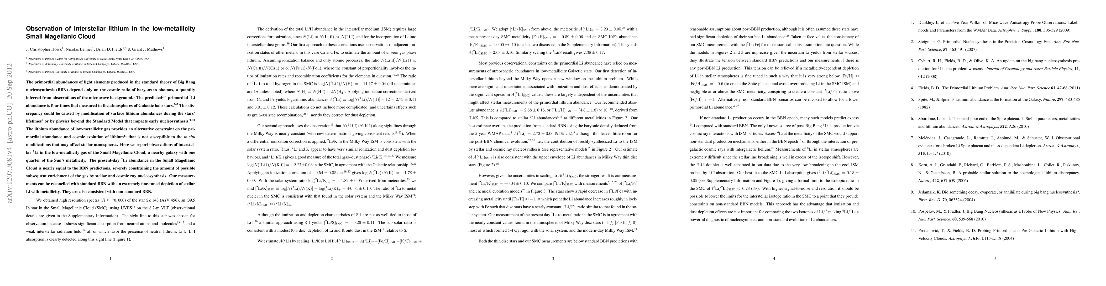 This paper reports observations of interstellar lithium in the Small Magellanic Cloud, revealing its abundance nearly matches Big Bang nucleosynthesis predictions, challenging the discrepancy between predicted and stellar lithium abundances. These findings suggest either fine-tuned stellar lithium depletion or non-standard nucleosynthesis scenarios.