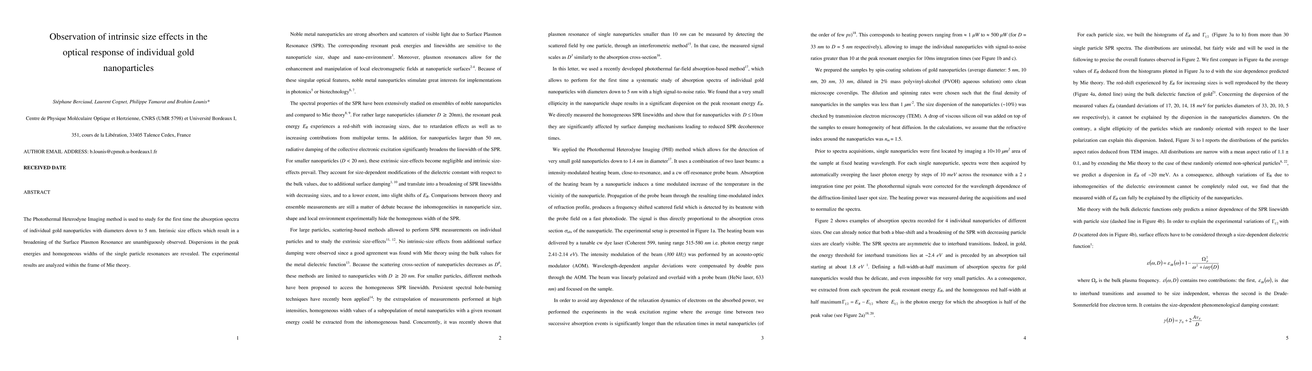 This paper uses Photothermal Heterodyne Imaging to observe the intrinsic size effects in the optical response of individual gold nanoparticles as small as 5 nm, revealing broadening of the Surface Plasmon resonance and dispersions in peak energies. The findings are analyzed using Mie theory.