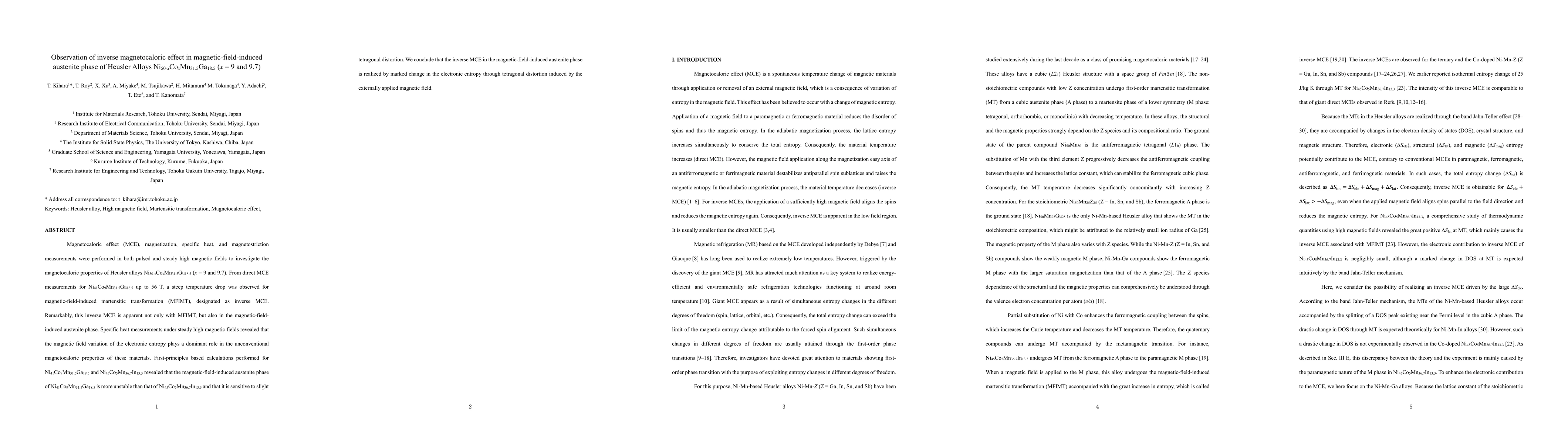 This study investigates the inverse magnetocaloric effect in Heusler alloy Ni50-xCoxMn31.5Ga18.5 (x = 9 and 9.7) under magnetic fields, revealing a significant temperature drop during martensitic transformation and in the magnetic-field-induced austenite phase. The effect is attributed to the magnetic field-induced change in electronic entropy due to tetragonal distortion.