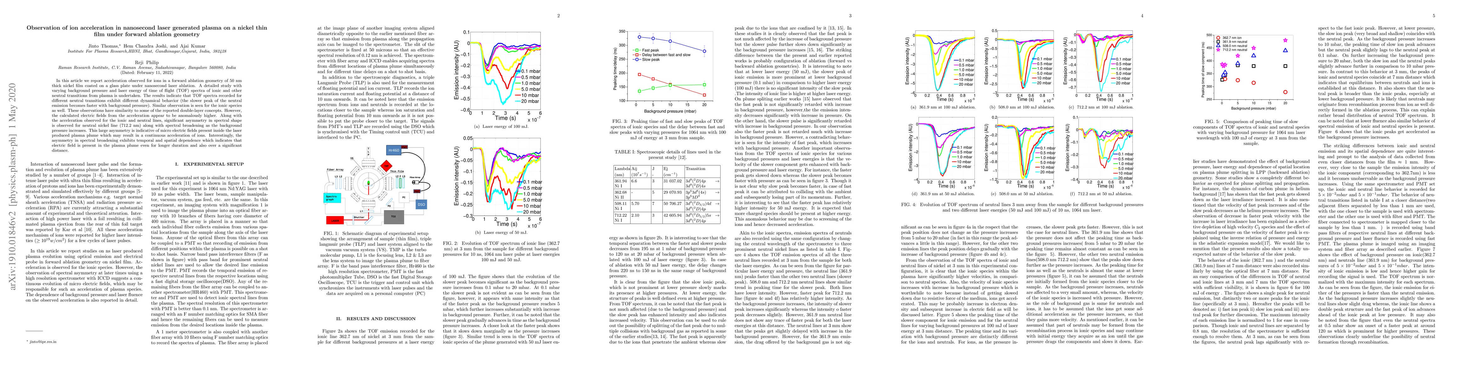 In this article we report acceleration observed for ions in a forward ablation geometry of 50 nm thick nickel film coated on a glass plate under nanosecond laser ablation. A detailed study with varying background pressure and laser energy of time of flight (TOF) spectra of ionic and other neutral transitions from plasma is undertaken. The results indicate that TOF spectra recorded for different neutral transitions exhibit different dynamical behavior (the slower peak of the neutral emission becomes faster with background pressure). Similar observation is seen for the ionic species as well. These observations have similarity to some of the reported double-layer concepts. However, the calculated electric fields from the acceleration appear to be anomalously higher. Along with the acceleration observed for the ionic and neutral lines, significant asymmetry in spectral shape is observed for neutral nickel line (712.2 nm) along with spectral broadening as the background pressure increases. This large asymmetry is indicative of micro electric fields present inside the laser produced plasma plume which may result in a continuous acceleration of ions. Interestingly, the asymmetry in spectral broadening exhibits temporal and spatial dependence which indicates that electric field is present in the plasma plume even for longer duration and also over a significant distance.