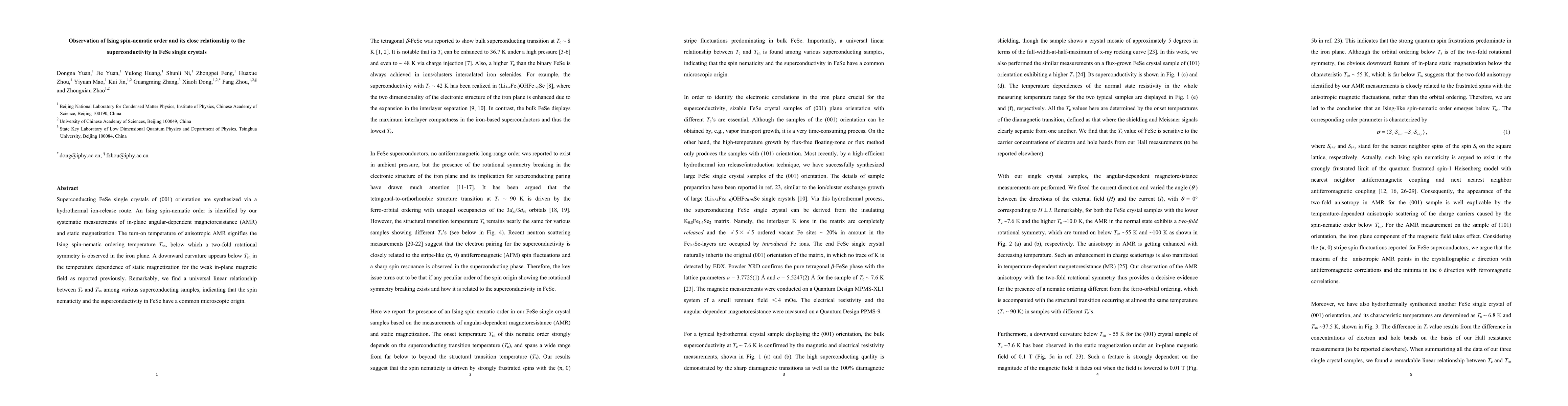 Superconducting FeSe single crystals of (001) orientation are synthesized via a hydrothermal ion-release route. An Ising spin-nematic order is identified by our systematic measurements of in-plane angular-dependent magnetoresistance (AMR) and static magnetization. The turn-on temperature of anisotropic AMR signifies the Ising spin-nematic ordering temperature Tsn, below which a two-fold rotational symmetry is observed in the iron plane. A downward curvature appears below Tsn in the temperature dependence of static magnetization for the weak in-plane magnetic field as reported previously. Remarkably, we find a universal linear relationship between Tc and Tsn among various superconducting samples, indicating that the spin nematicity and the superconductivity in FeSe have a common microscopic origin.