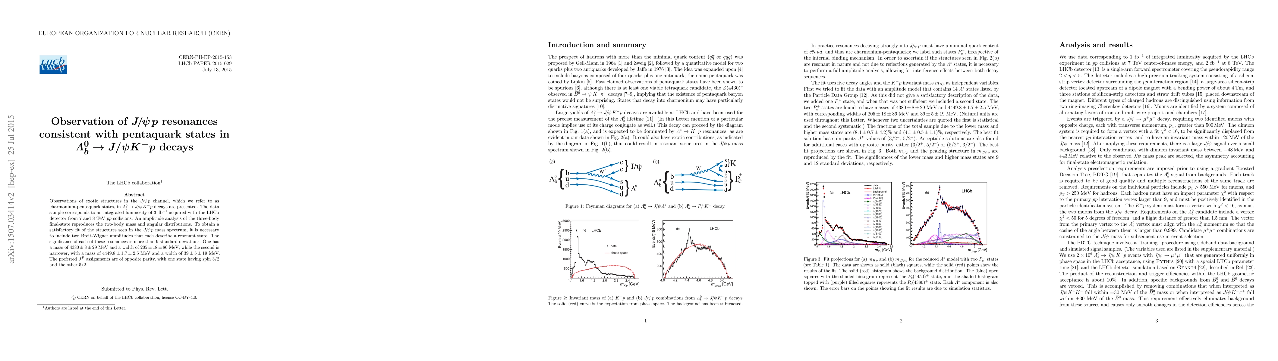 This paper reports the observation of two $J/\psi p$ resonances in $\Lambda_b^0\to J/\psi K^- p$ decays, consistent with pentaquark-charmonium states, with masses of $4380\pm 8\pm 29$ MeV and $4449.8\pm 1.7\pm 2.5$ MeV, respectively, and differing spin-parity assignments of 3/2 and 5/2. The findings are based on an amplitude analysis of data from LHCb at 7 and 8 TeV.
