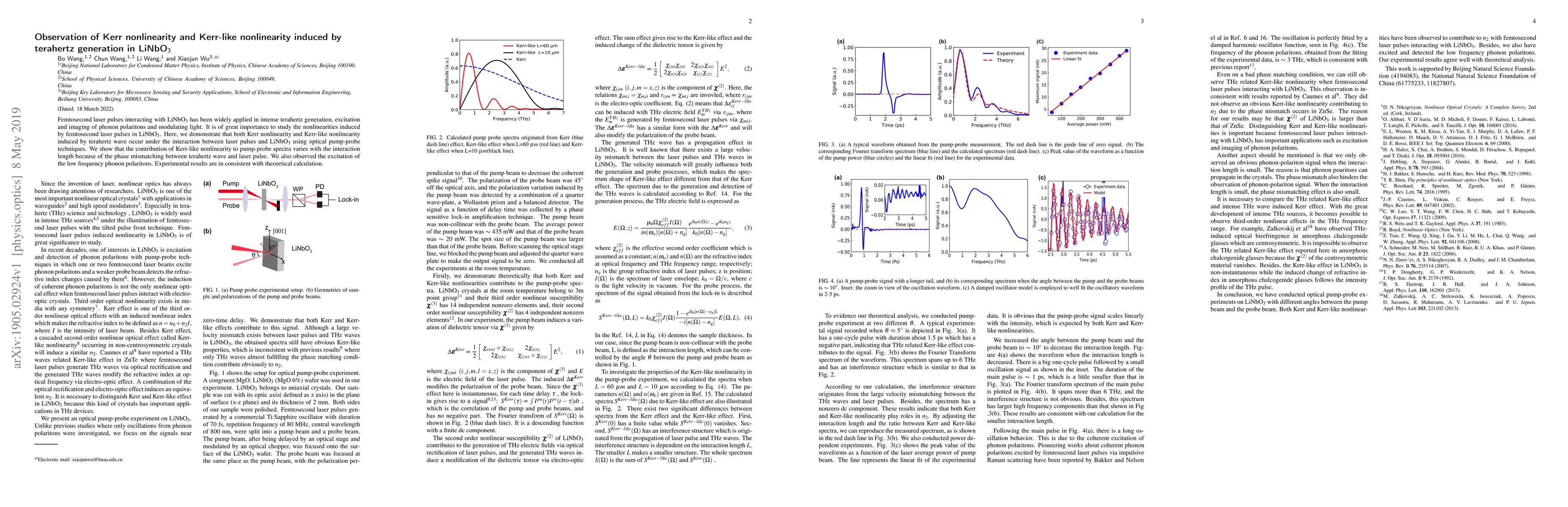 This paper demonstrates the observation of Kerr and Kerr-like nonlinearities in LiNbO$_3$ induced by terahertz generation using femtosecond laser pulses. The study reveals that the contribution of Kerr-like nonlinearity varies with interaction length due to phase mismatching, and confirms the excitation of low-frequency phonon polaritons, with experimental results aligning with theoretical calculations.