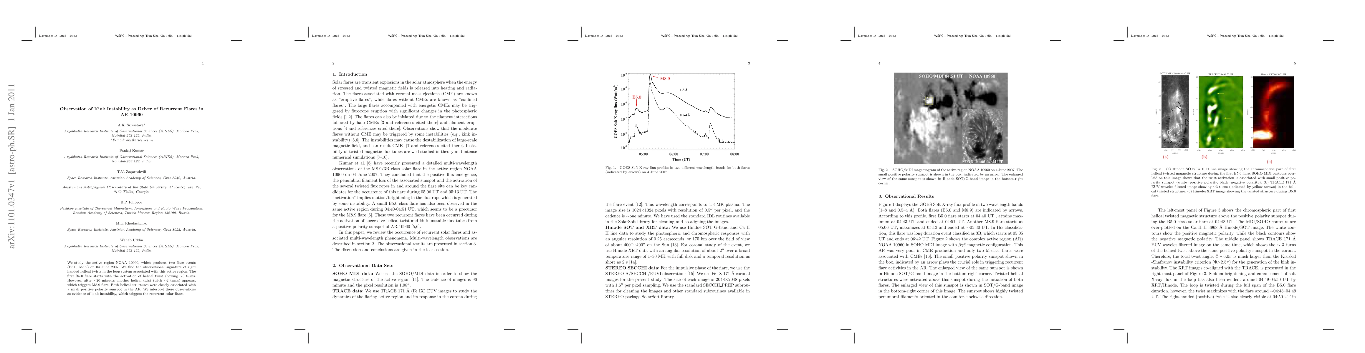 We study the active region NOAA 10960, which produces two flare events (B5.0, M8.9) on 04 June 2007. We find the observational signature of right handed helical twists in the loop system associated with this active region. The first B5.0 flare starts with the activation of helical twist showing ~3 turns. However, after ~20 minutes another helical twist (with ~2 turns) appears, which triggers M8.9 flare. Both helical structures were closely associated with a small positive polarity sunspot in the AR. We interpret these observations as evidence of kink instability, which triggers the recurrent solar flares.